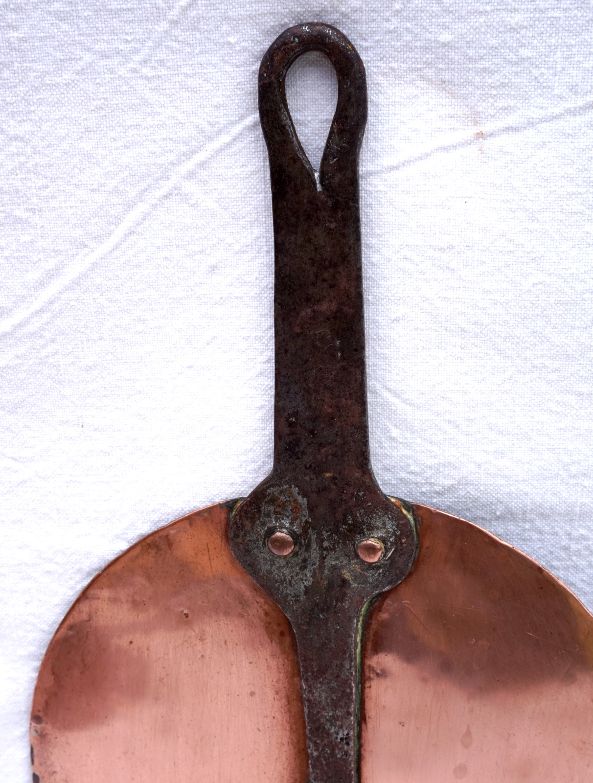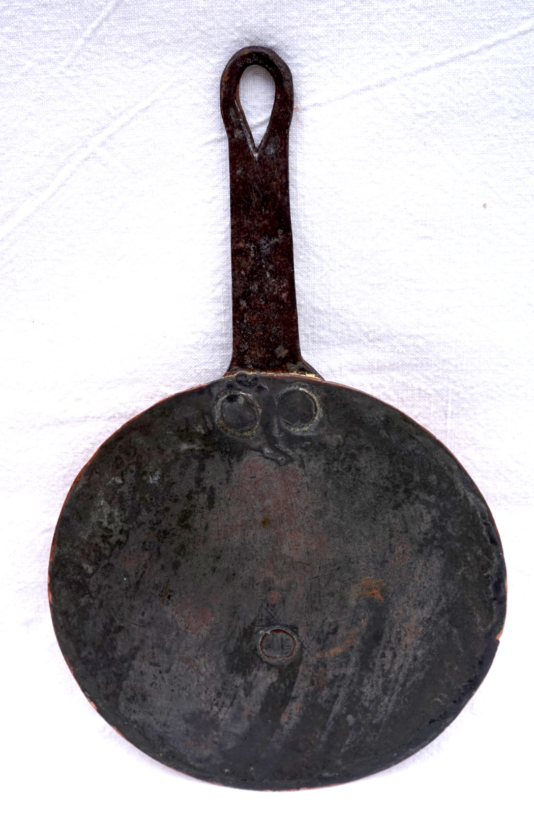 Couvercle en cuivre étamé à manche fer forgé, monogrammé IT, fin XIX° siècle. Diamètrte 14.5 cm, largeur avec le manche 23.7 cm. Très bel état.