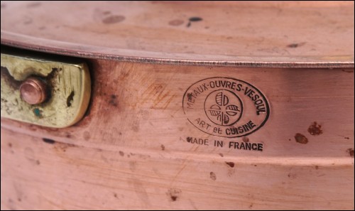 French cookware tinned copper with brass handles made by Metaux ouvres during the mid-century. It's stamped on the edge. 12" (30.5cm) total length, 9 1/2" (24.2cm) length without handles, 6 7/8" (17.5cm) width, 3 3/4" (9.5cm) height, weight 4lb 7.88oz (2.038kilograms). Good condition a few small stains as shown by the following pictures.
