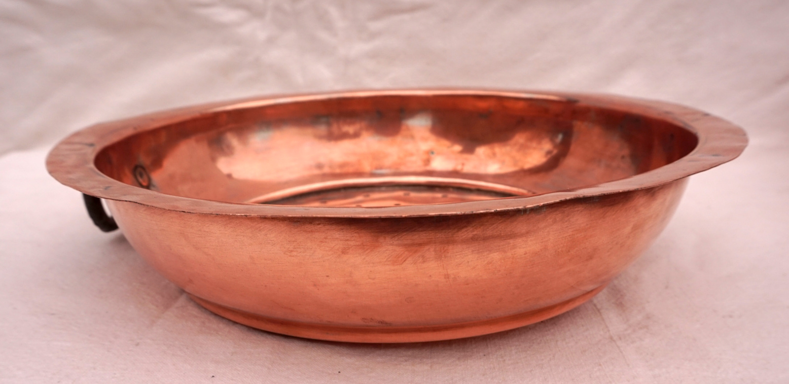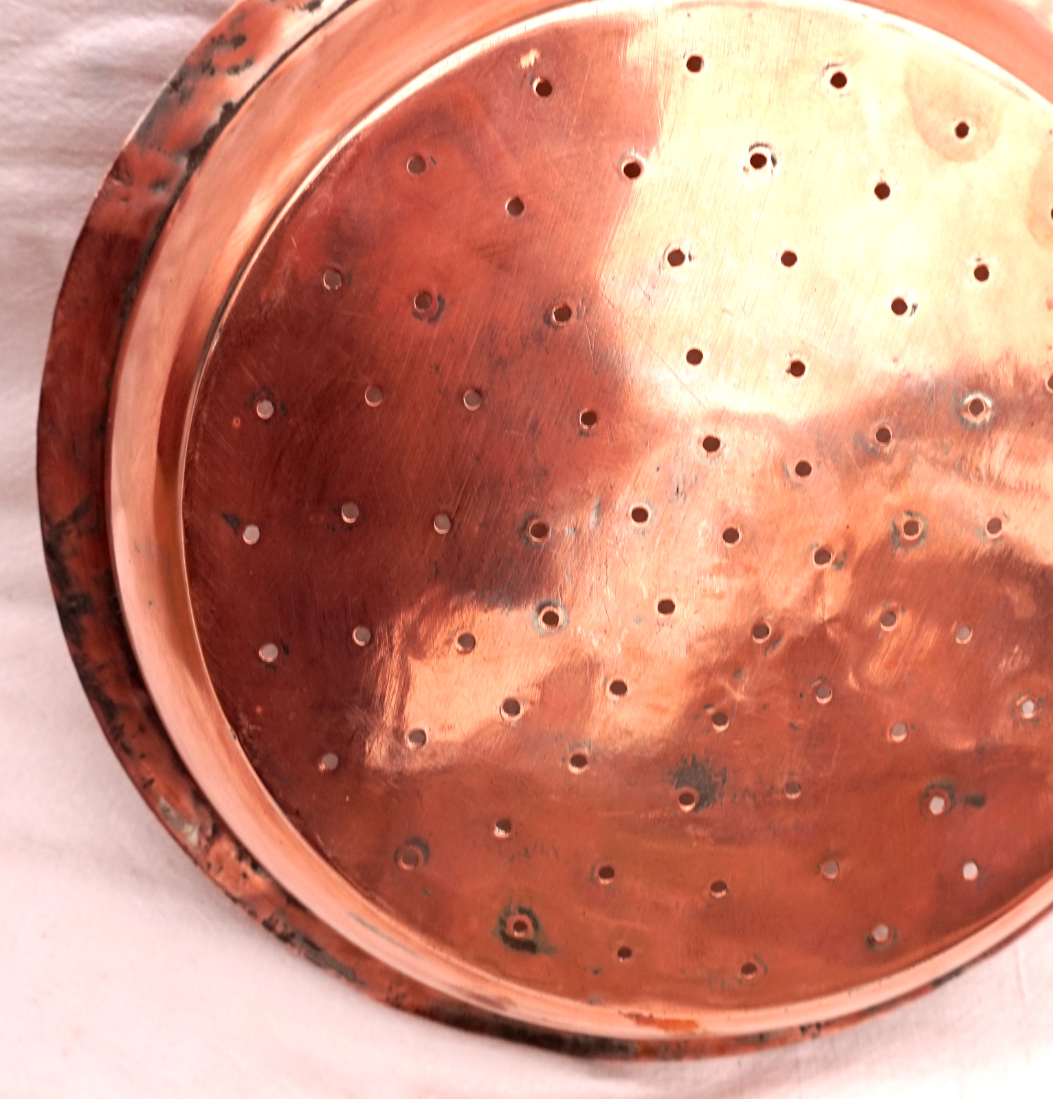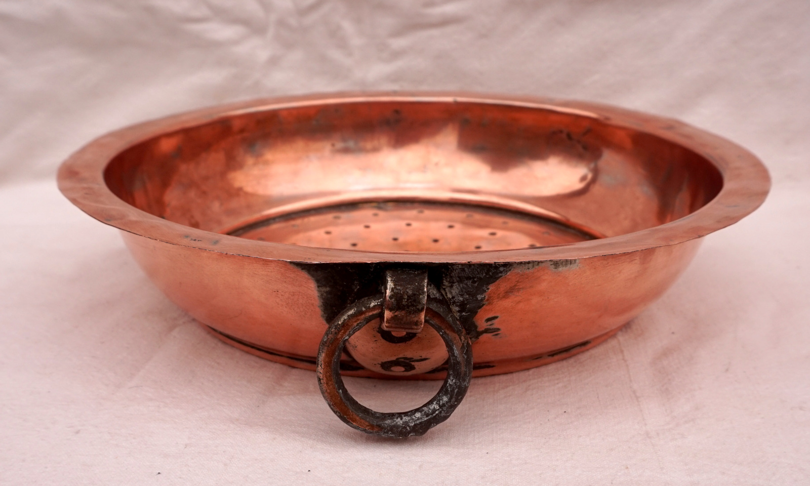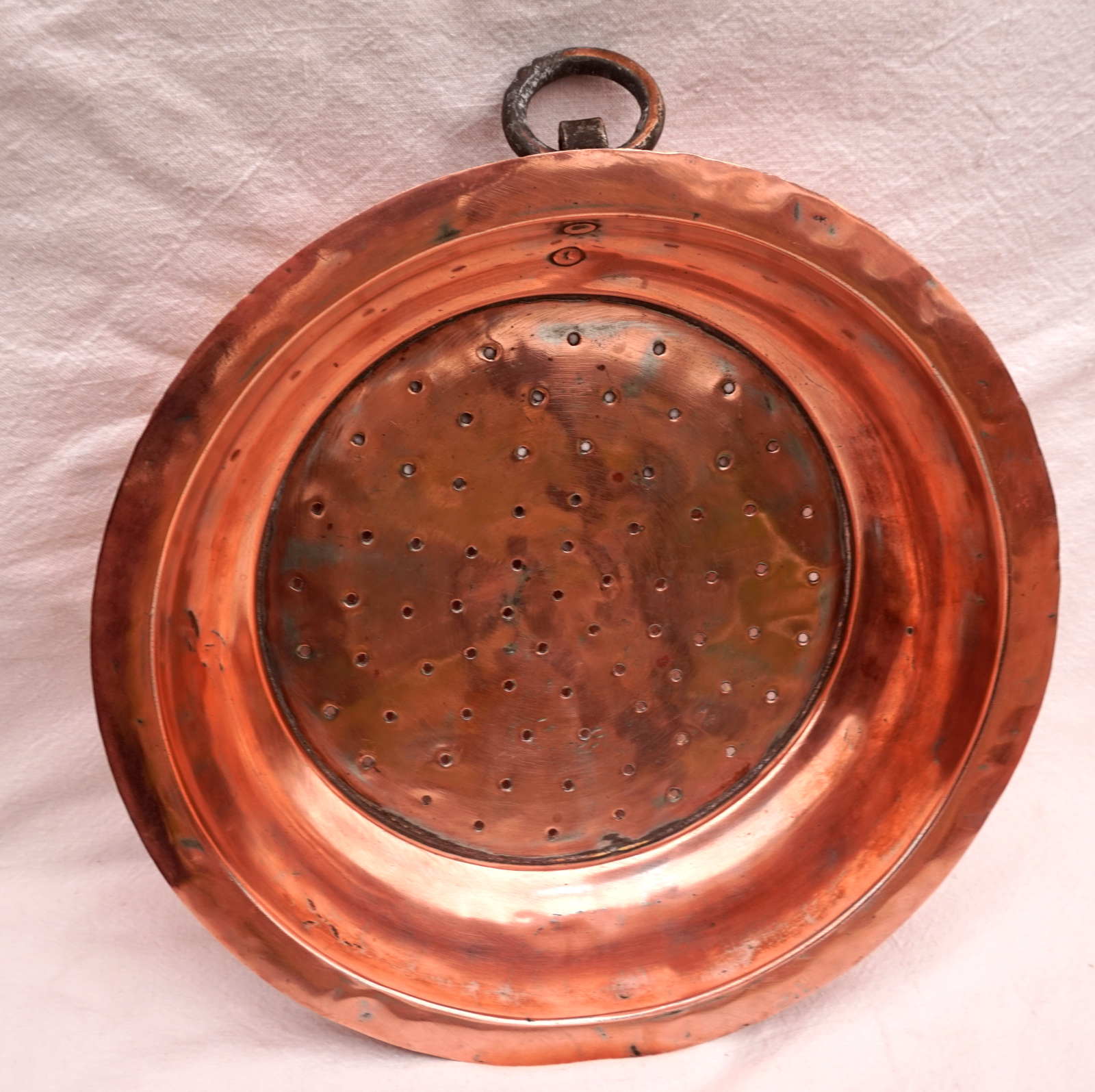 Egouttoir en cuivre pour les fruits , fin XIX° siècle, avec anneau de suspension. Diamètre 27.5 cm, hauteur 5.7 cm, poids 574 gr. Parfait état.