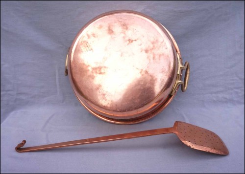 French copper cookware jam pan with brass handle and skimmer set made in France during the 1900's. They measure for the pan without handles: 13 3/8" (34cm) diameter, 4 3/4" (12cm) heightn for the skimmer 20" (51cm) length, 4" (10cm) width, weight of the set 6lb 11.69oz (3.053kilograms). Perfect condition and ready for use as shown by the following pictures.