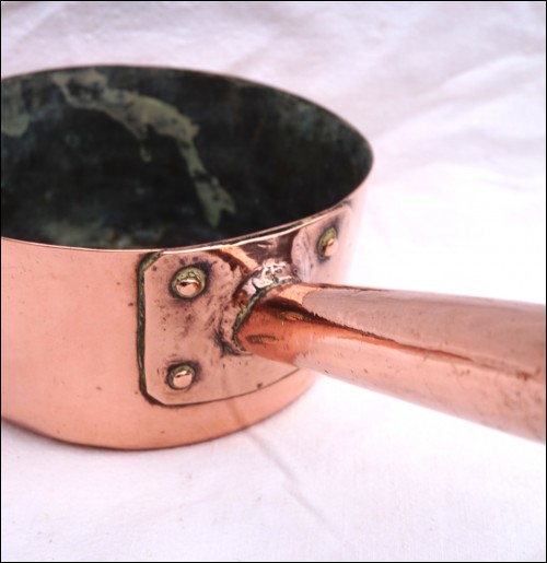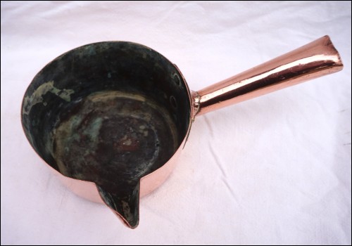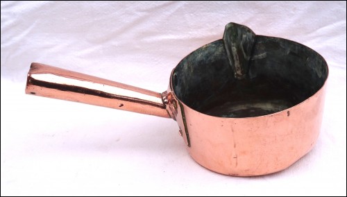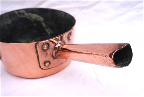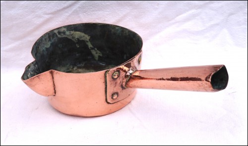 Casserole à sucre en cuivre et manche cuivre, vers 1900. Largeur avec le bec 19.5 cm, avec le manche 28.2 cm, hauteur 8 cm, poids 680 gr. Bel états, quelques bosses à la base.