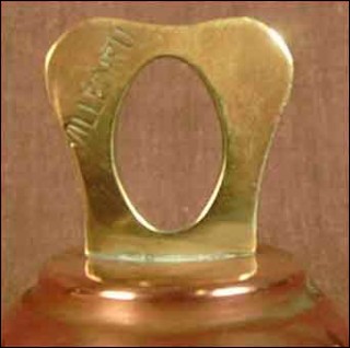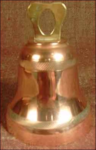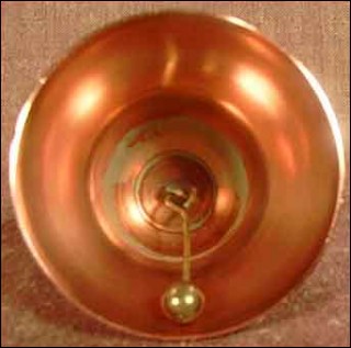 This copper hand bell has been made for the celebration of St Therese (1907-1957) of Keryado near. It's signed on the handle with Villedieu copper factory in Normandy. Good condition. 3"1/2 tall 2"5/8 diameter.