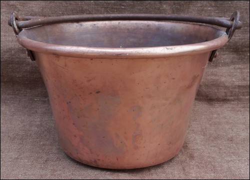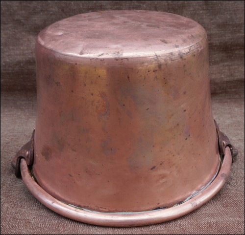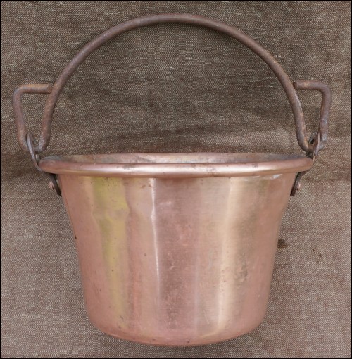 French copper apple butter kettle with wrought iron handle made late 19th century. Perfect condition, ready for use. 10 3/8" high overall 5 5/8" high without handle 8 7/8" diameter.