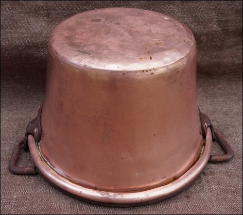 Petit chaudron de cheminée en cuivre et fer forgé, fin XIXème siècle. Bel état. Hauteur totale 26,3 cm, hauteur du chaudron 14,5 cm, diamètre 22,5 cm.