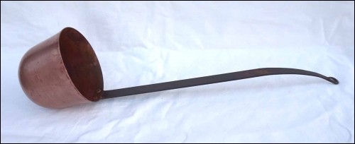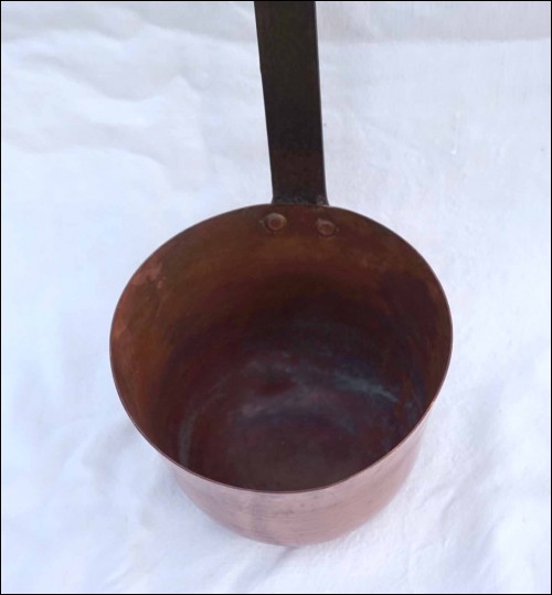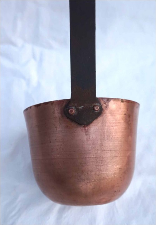 French copper wter laddle with wrought iron handle made late of 19th century. 23 5/8" (60cm) length overall, 4 3/4" (12cm) height of the copper laddle, 5 7/8" (14.8cm) diameter, weight 1lb 7.70oz (672 grams), capacity 1.5 quart (1.5liter). Perfect condition as shown by the following pictures.