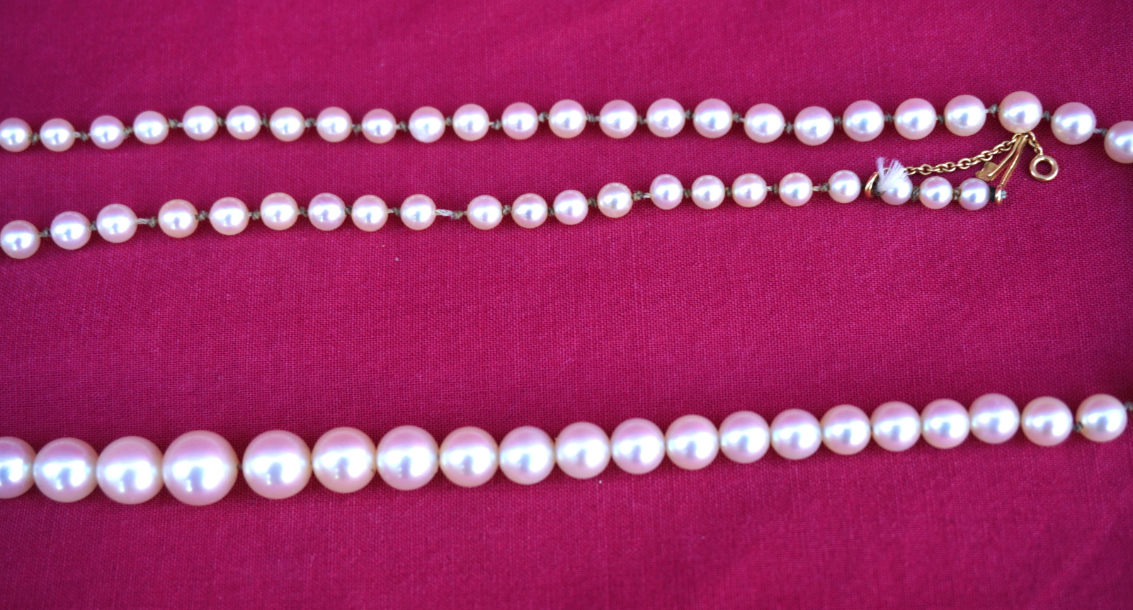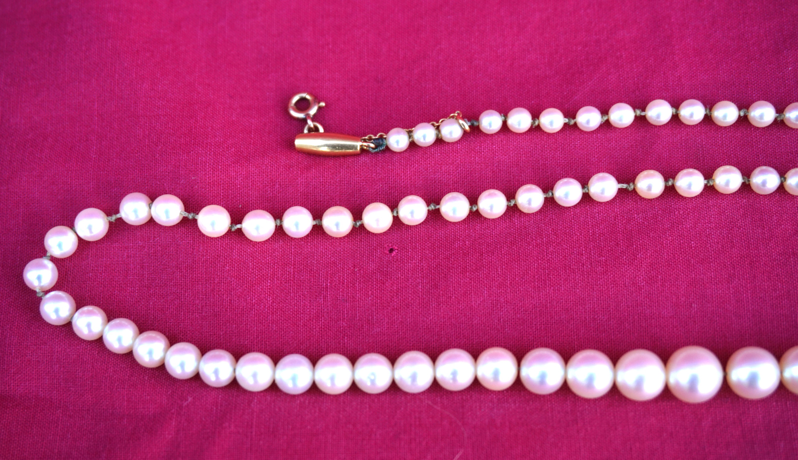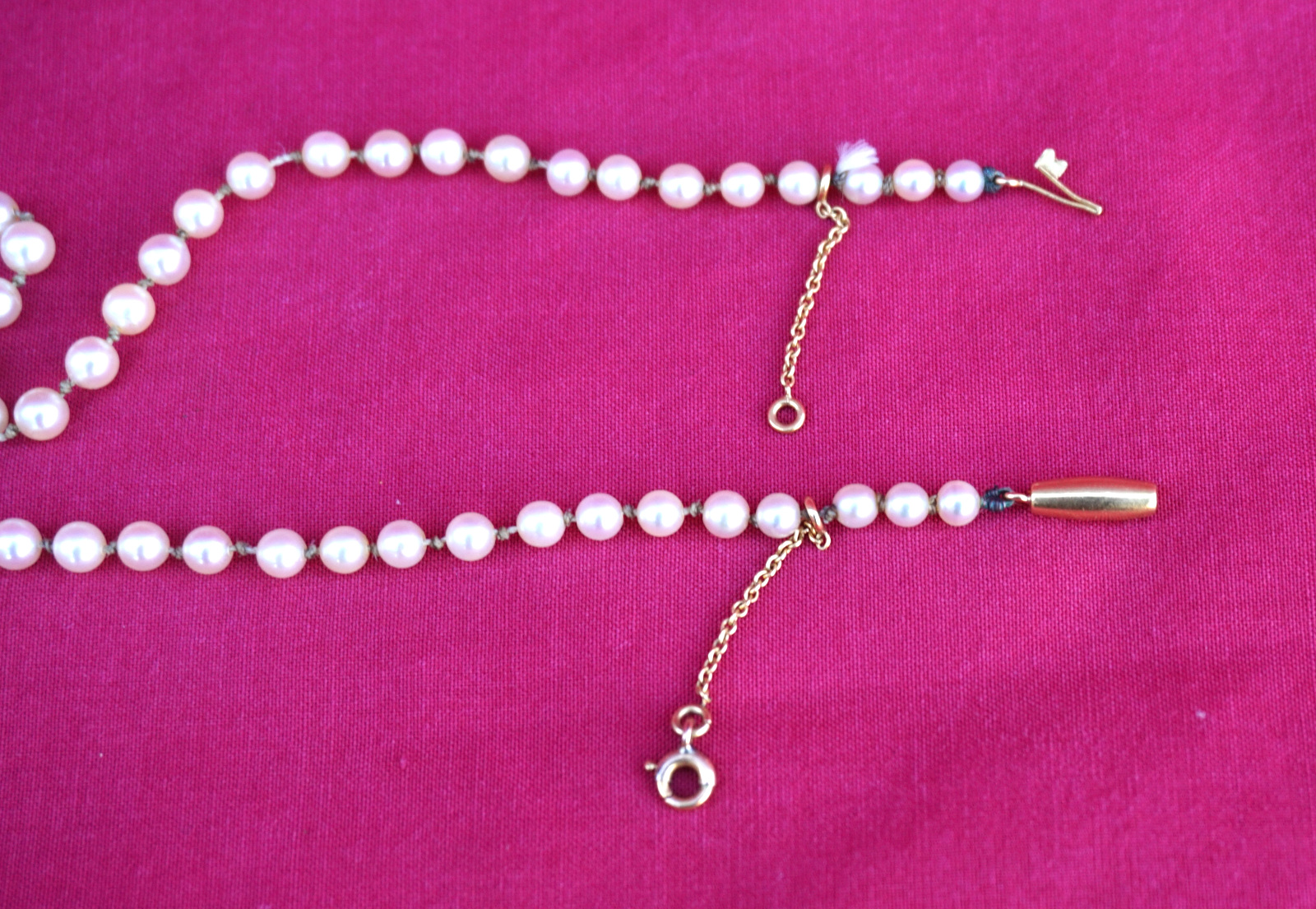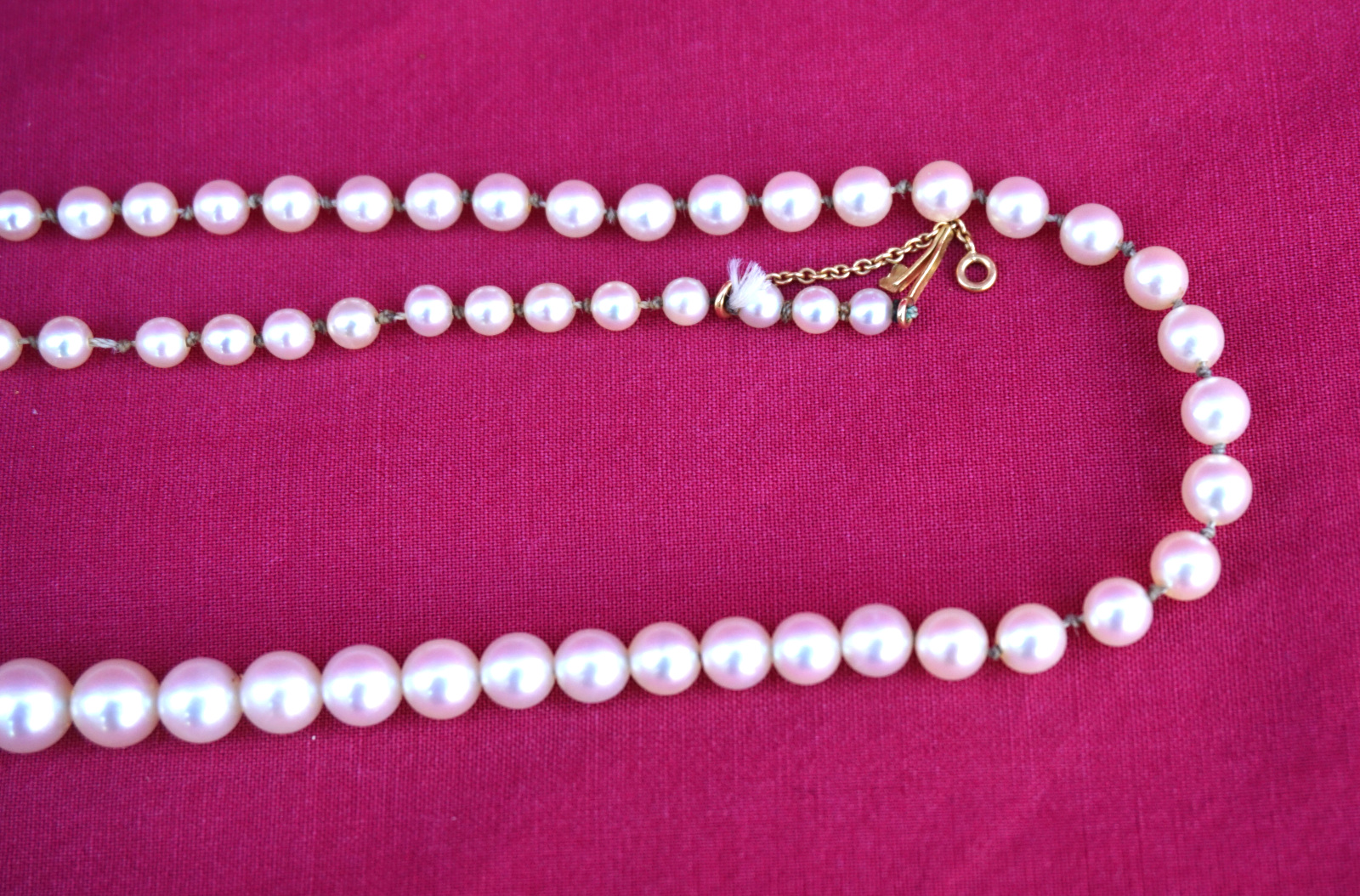 Ancien collier de perles de culture avec fermoir en or. 101 perles en chute, la plus grosse dimètre 7mm, longueur 53cm, poids 13.92 grammes.