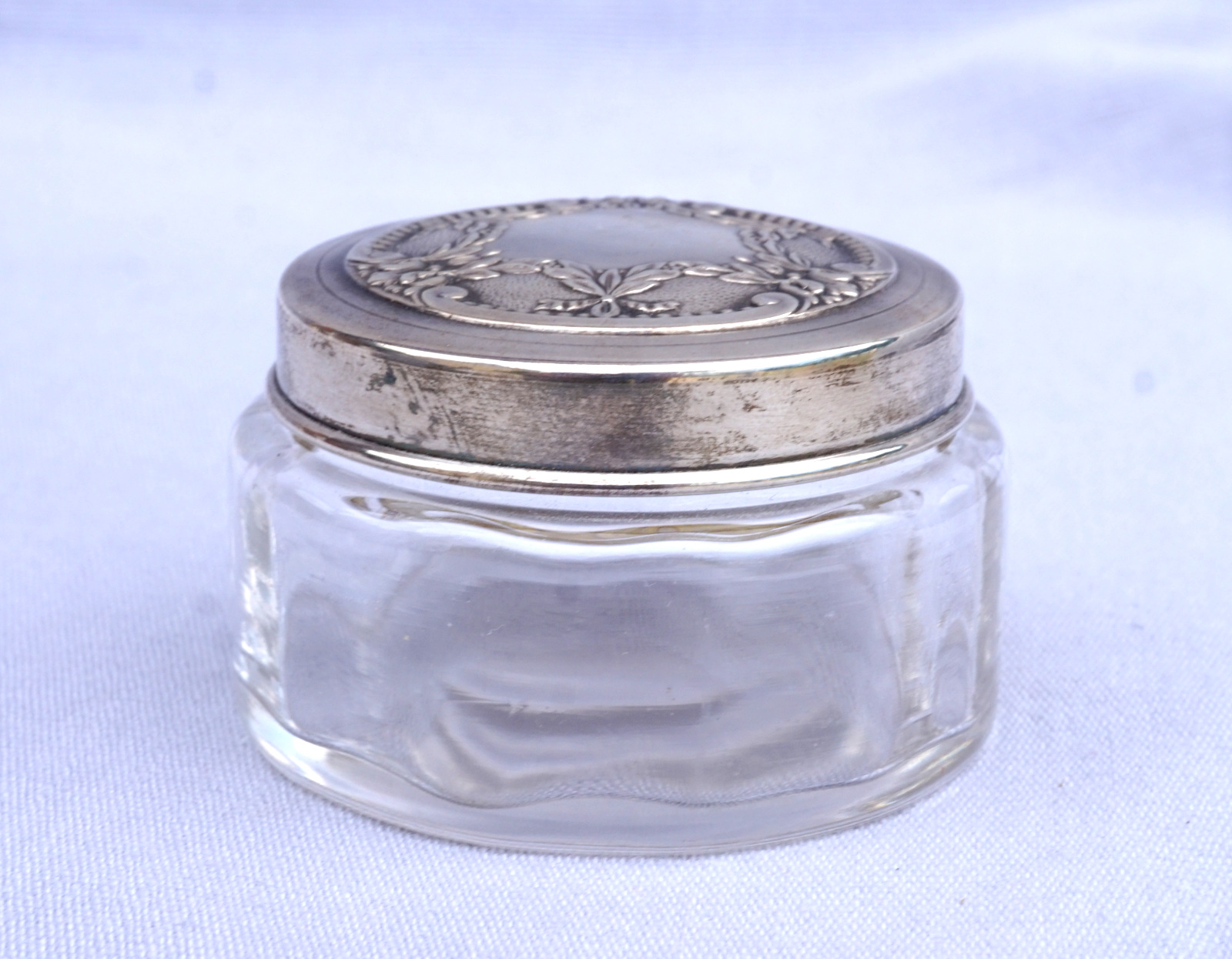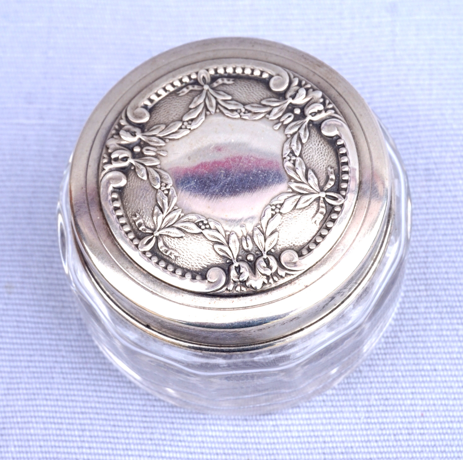 Cut Crystal Sterling Silver Lid Powder Box Floral Garlands 1900's