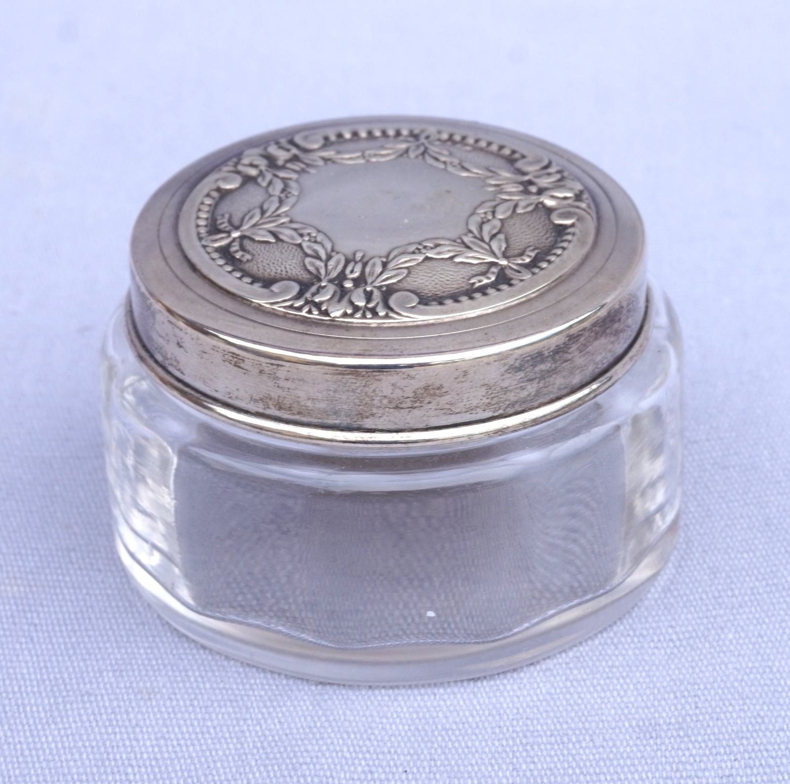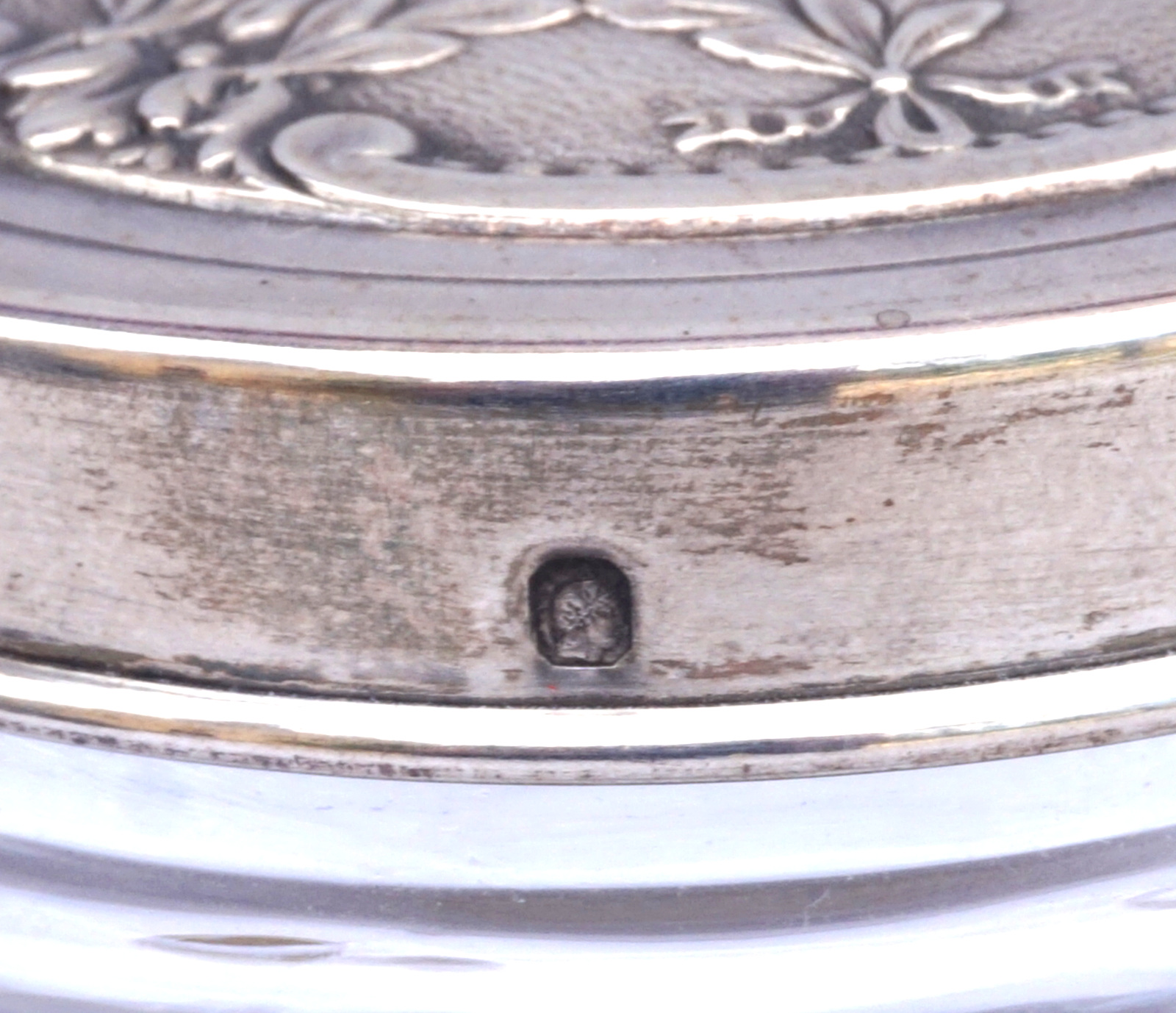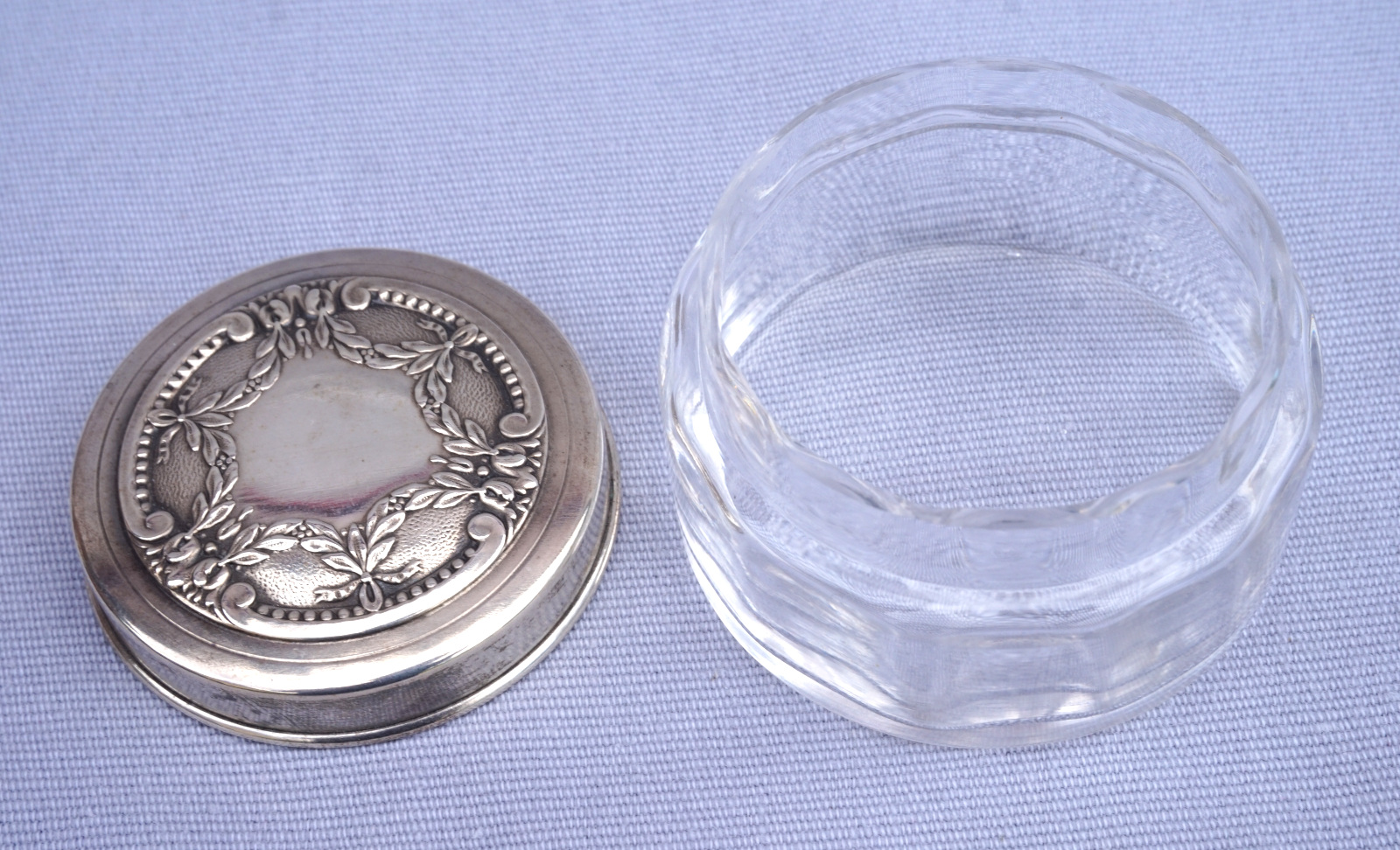 Poudrier en cristal taillé et couvercle en argent massid décoré de guirlandes de fleurs et vermeil à l'intérieur vers 1900. Diamètre 6.3cm, hauteur 4cm, poids du couvercle 17.10gr. Le couvercle est poinçonné de la Minerve, 1° titre. Très bel état.