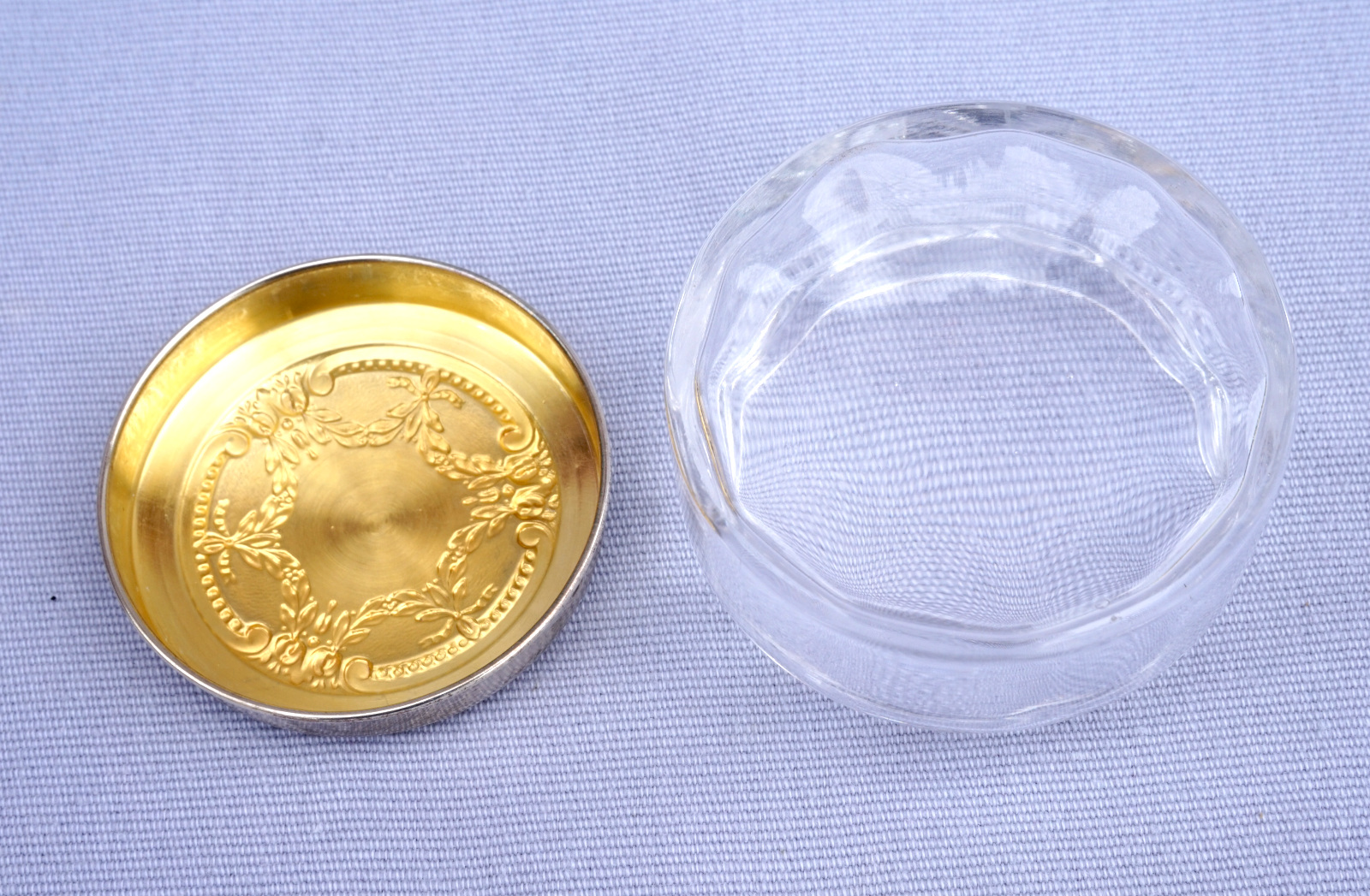 French cut crystal with sterling silver lid ornate with floral garlands and vermeil inside power box made during the 1900's. The lid is hallmarked with the head of Minerva, french sterling silver (.925) guarantee. 2 1/2" (6.3cm) diameter, 1 1/2" (4cm) height, weight of the lid 17.10 grams. Perfect condition