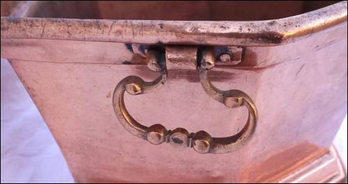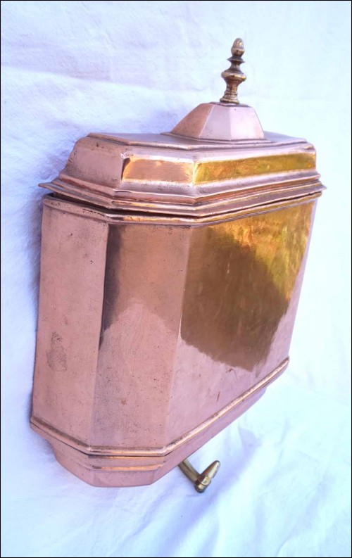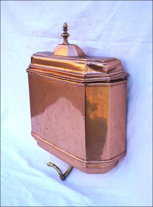 Fontaine murale, réservoir et bassin, en cuivre monté à créneau fin XVII°, début XIX° siècle. Dimensions: pour le réservoir largeur 31.6+cm, hauteur 52cm, profondeur 10.8cm; pour le bassin largeur 41.2cm, profondeur 33cm, hauteur 24.2cm, poids de l'ensemble 10.130kg. Bel état, un choc sur le couvercle du réservoir.