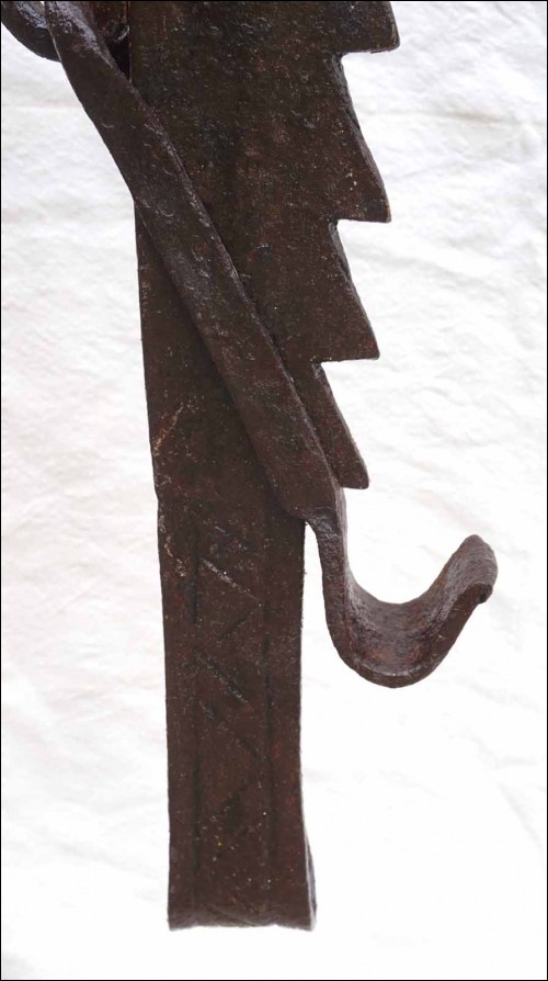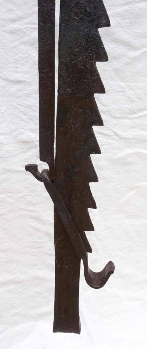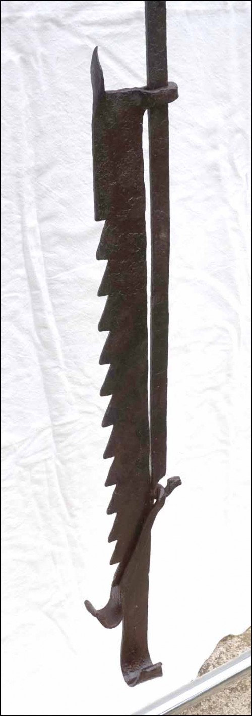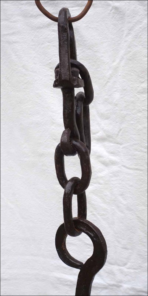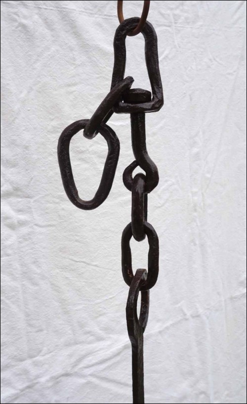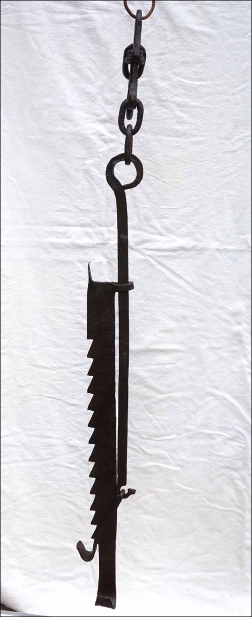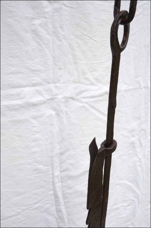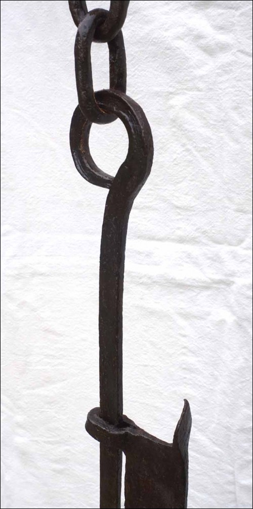 Antique large hand worked wrought iron adjustable trammel with sawtooth and geometric decor made in Brittany France early 18th century.57 1/2" (146cm) long to 75 1/4" (191cm) longest adjustement, 3 1/2" (9cm) width, weight 9lb 4.50oz (4.270 kilograms). Beautiful condition, works poerfectly as shown by the following pictures.