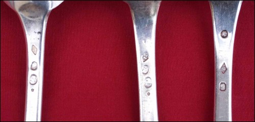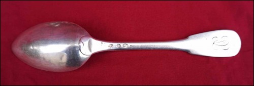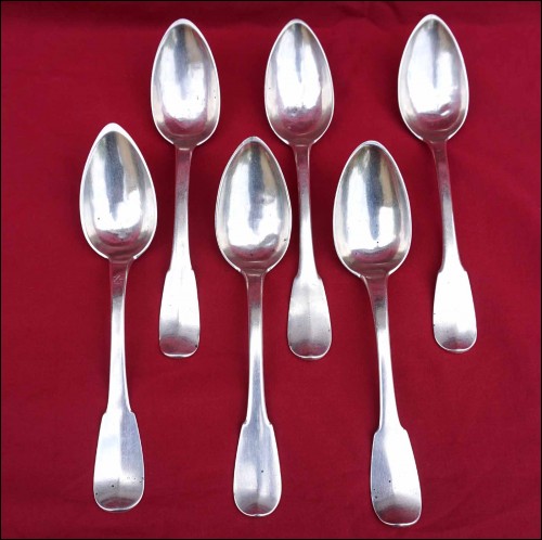 Six Cuillerées de table monogramme JC en argent massif d'époque Empire. Elles sont poinçonnées du Premier Coq argent 1° titre, de la tête de vieillard pour Paris ainsi que la marque de l'orfèvre PBL. Longueur 20,7 cm, poids de l'ensemble 400 gr. Bel état quelques usures.