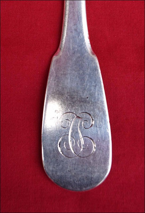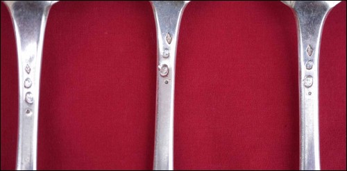 French Empire 6 dinner spoons with JC monogram in sterling silver made by PBL during the 1800's. They are hallmarked with the First Rooster french sterling silver (.925) guarantee, the Old Man head for Paris and the silversmith mark. 8 1/8" (20.7cm) length, wight of the set 14.109oz (400 grams). Good condition , a few small bumps and stains as shown by the following pictures.