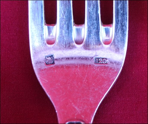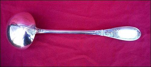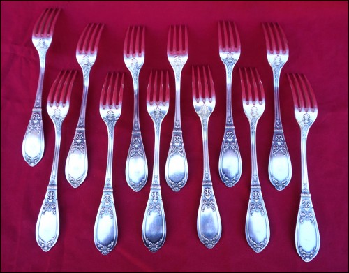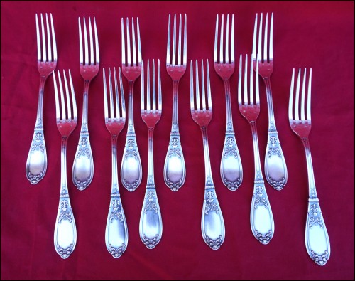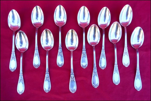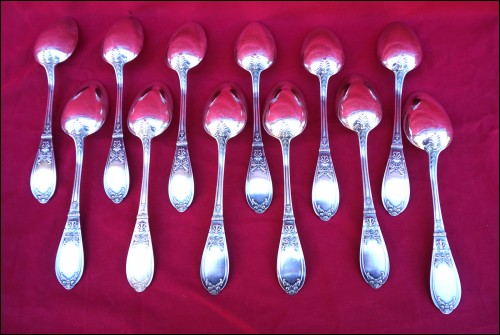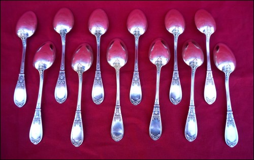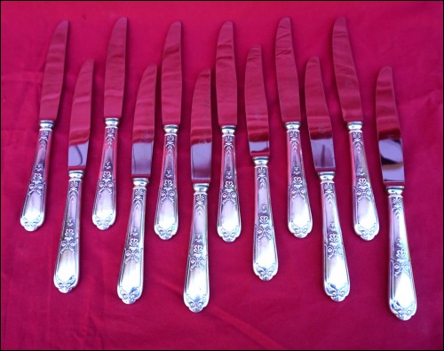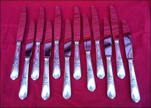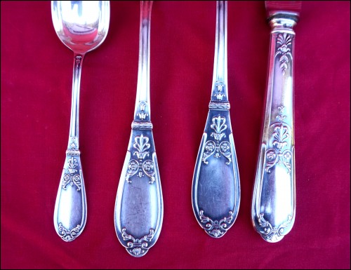Ménagère en métal argenté (grammage d'argent 120gr) de style Empire par ATO, Association de 3 Orfèvres, comprenant 12 cuillères et fourchettes de table, 12 couteaux lame inox, 12 cuillers dessert et 1 louche, première moitié du XX° siècle. Longueurs: pour les couteaux 25.5 cm, pour les fourchettes et cuillères de table 21.5 cm, pour les cuillères dessert 14.5 cm. Très bel état.