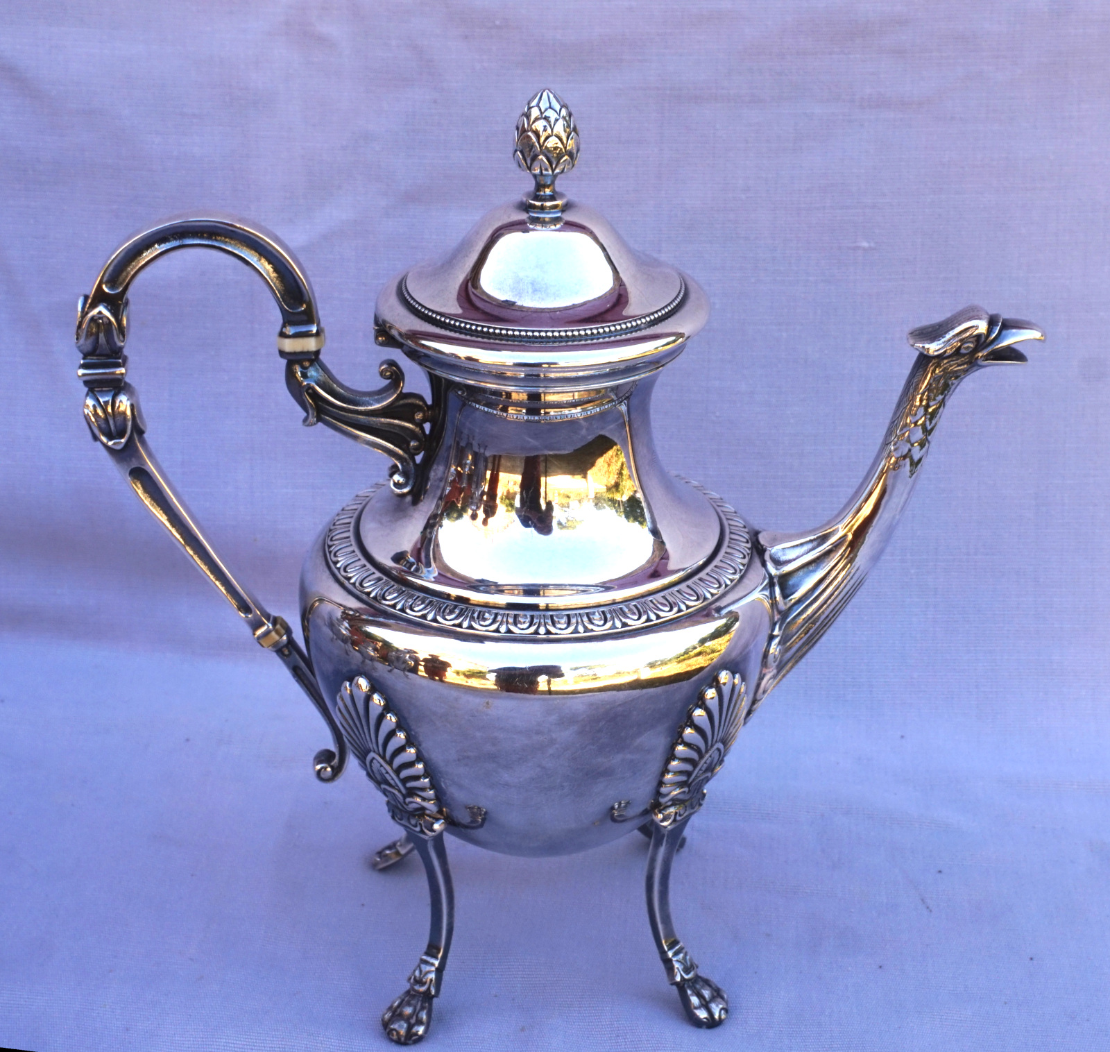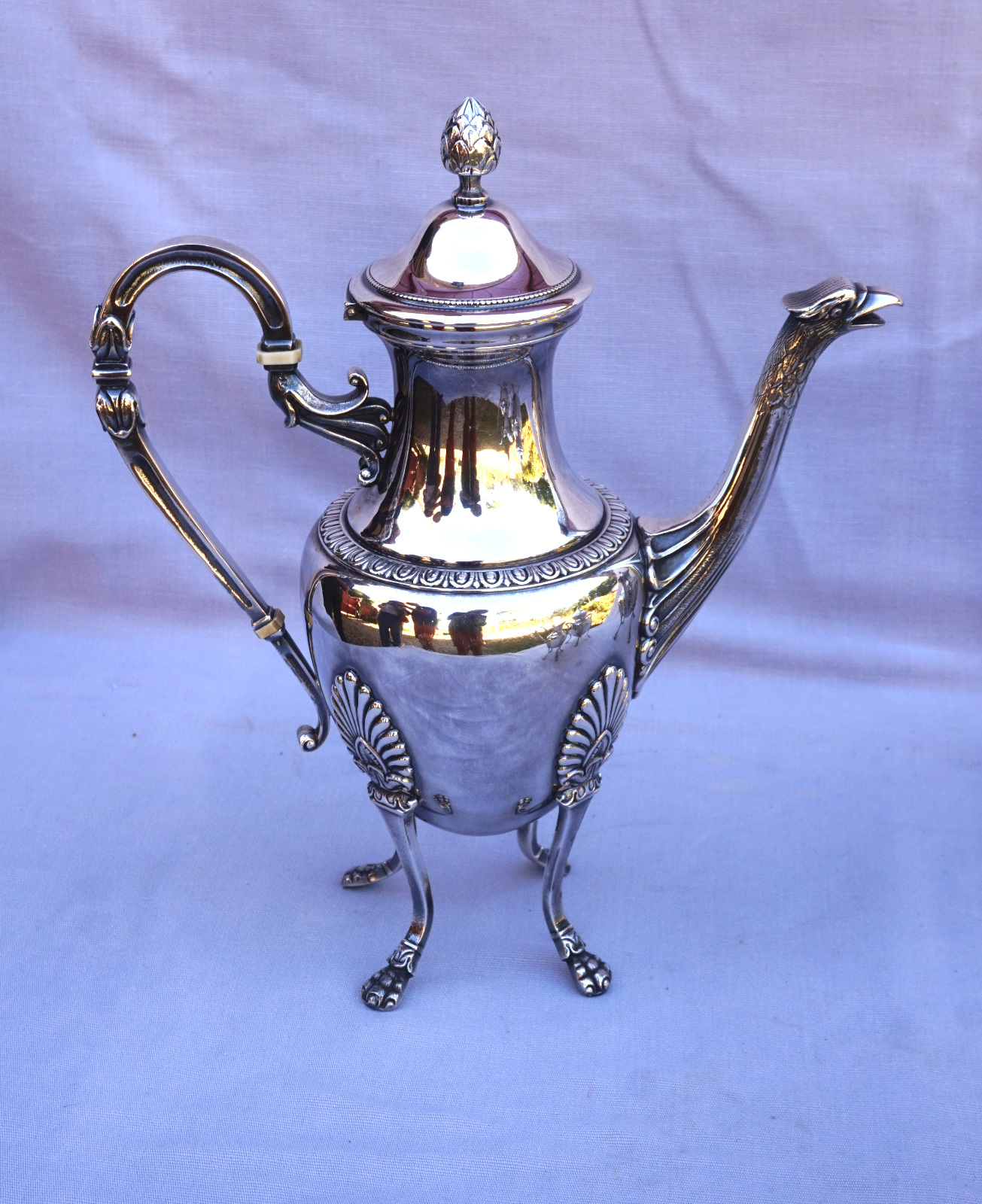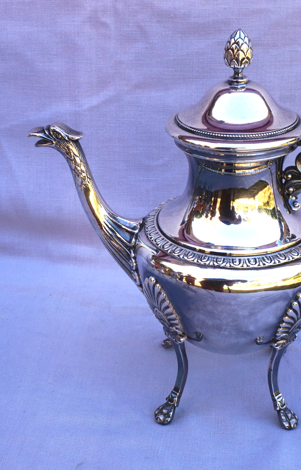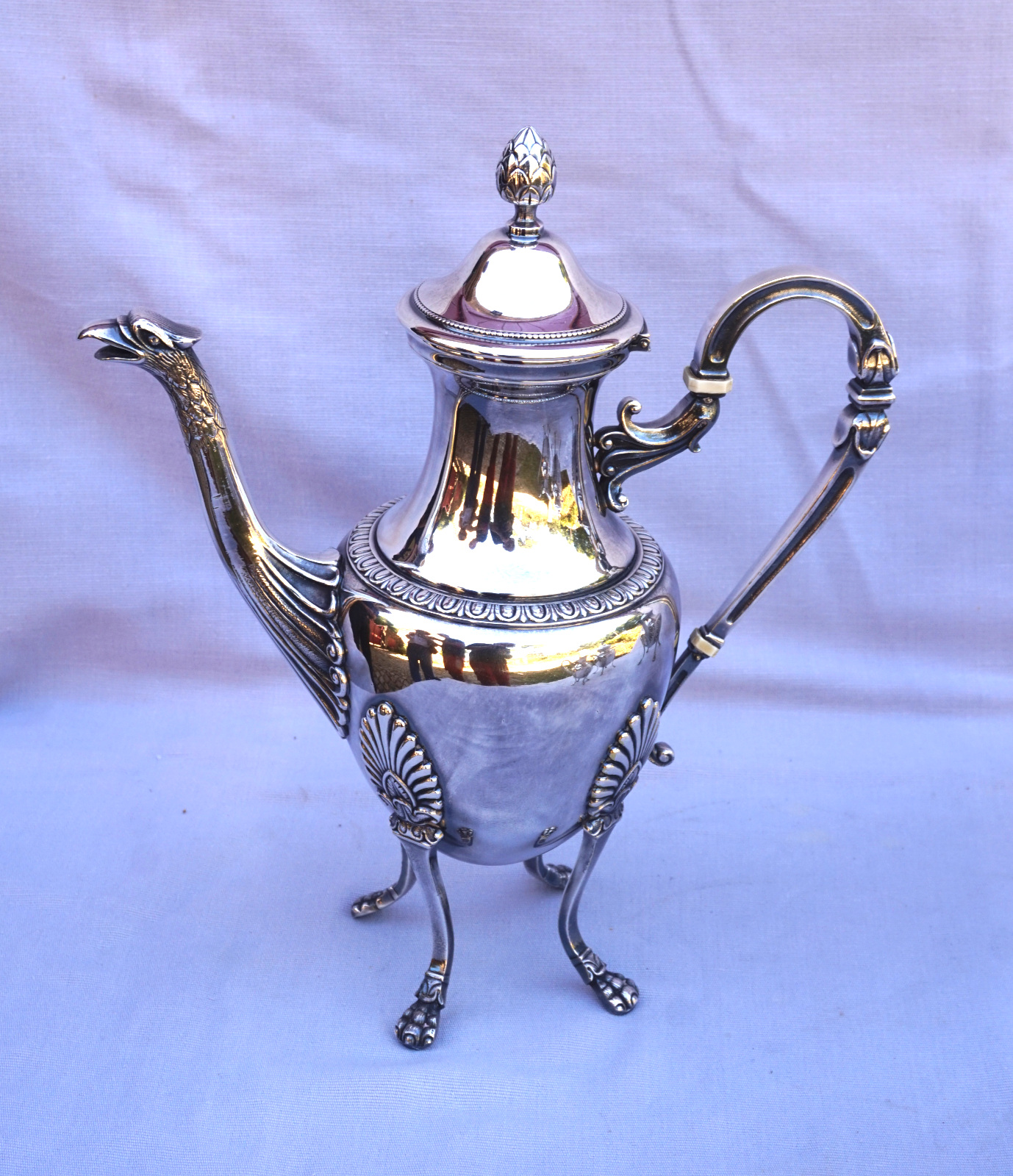 For our French-speaking friends Ensemble thé café de service sur plateau de style Empire, décor à tëte d'aigle et griffes de lion par Durousseau & Raynaud orfèvre à Lyon vers 1927. Toutes les pièces sont estampillées. Dimensions: pour le plateau 65 cm x 38.2 cm; pour la verseuse à café hauteur 30cm, largeur 27 cm, profondeur 12 cm, pour la théière hauteur 25cm, largeur 26 cm, profondeur 13 cm; pour le sucrier hauteur 21.5 cm, largeur 15.2 cm, profondeur 17.5 cm, pour le pot à lait hauteur 15 cm, largeur 12.5 cm, profondeur 8 cm, poids de l'ensemble 5.5 kg. Parfait état.