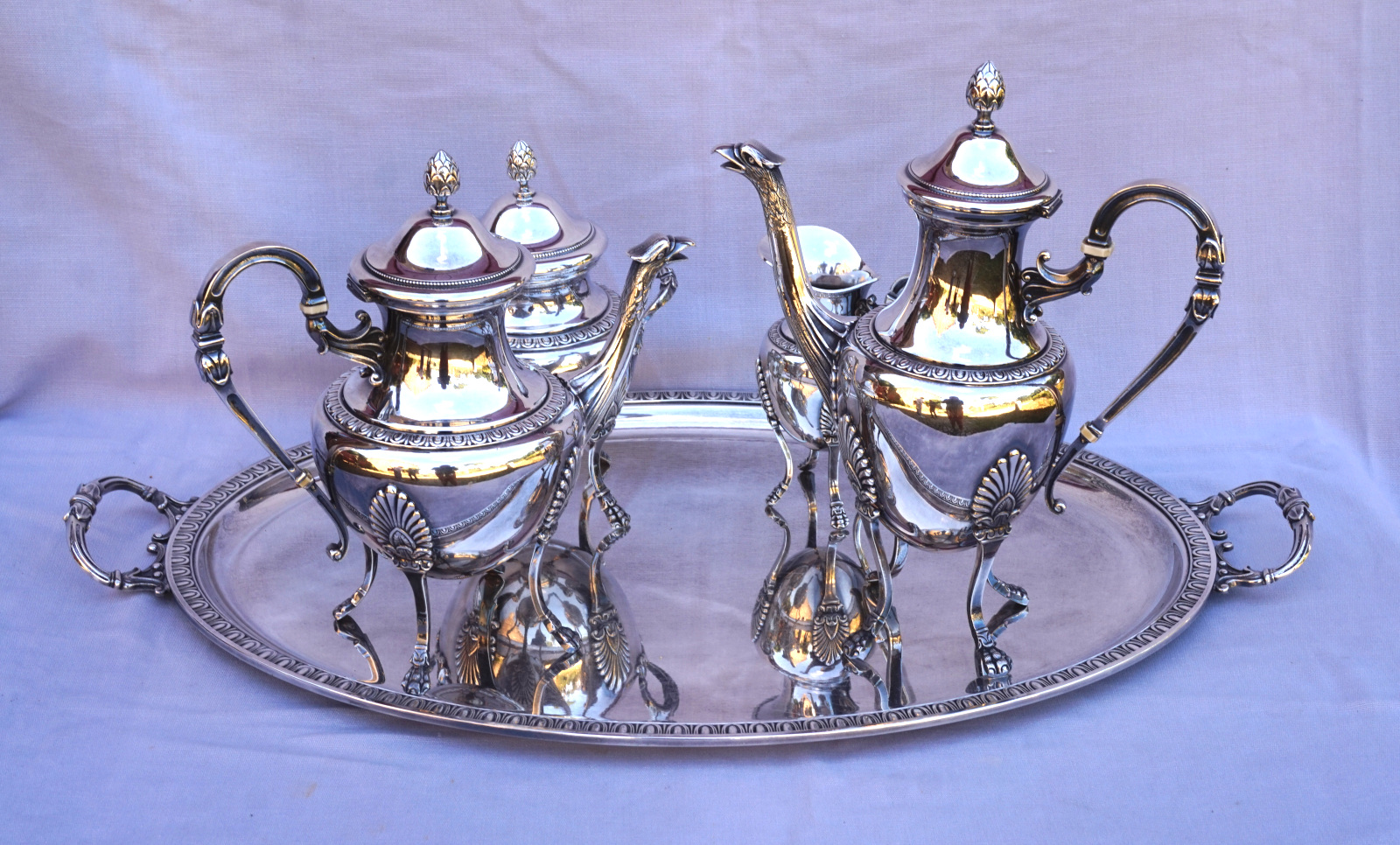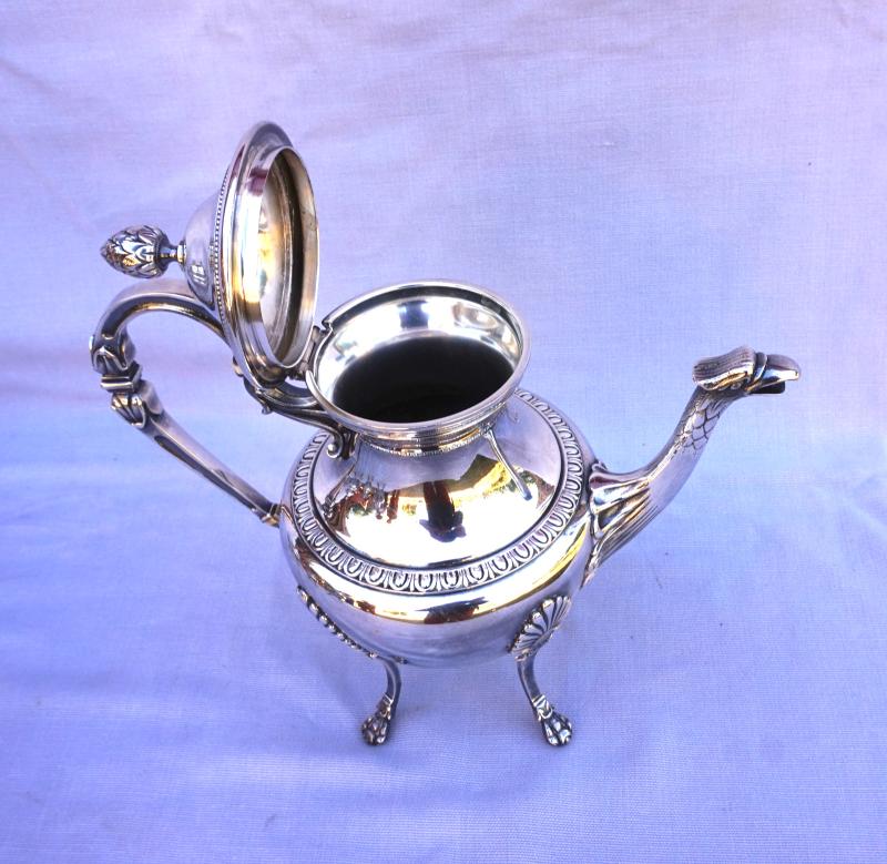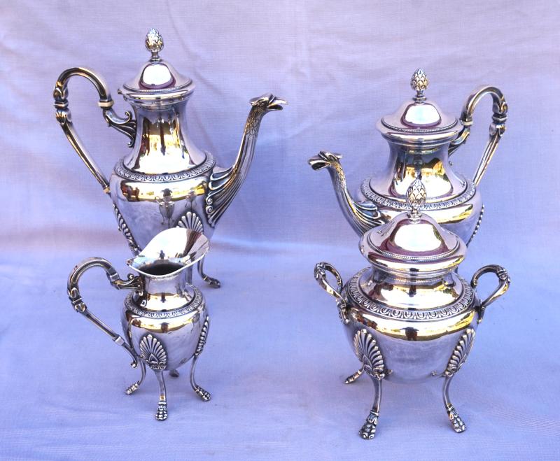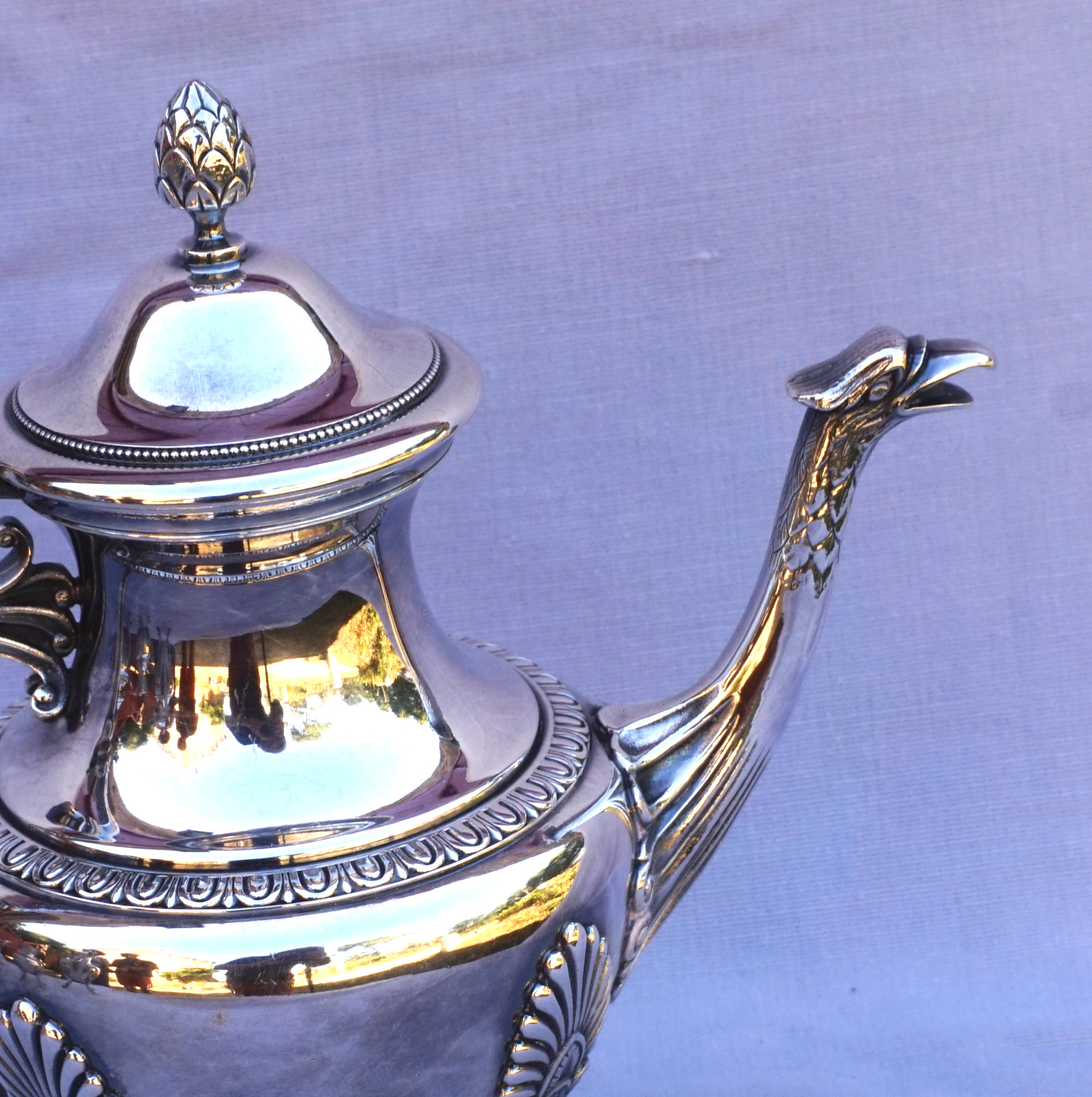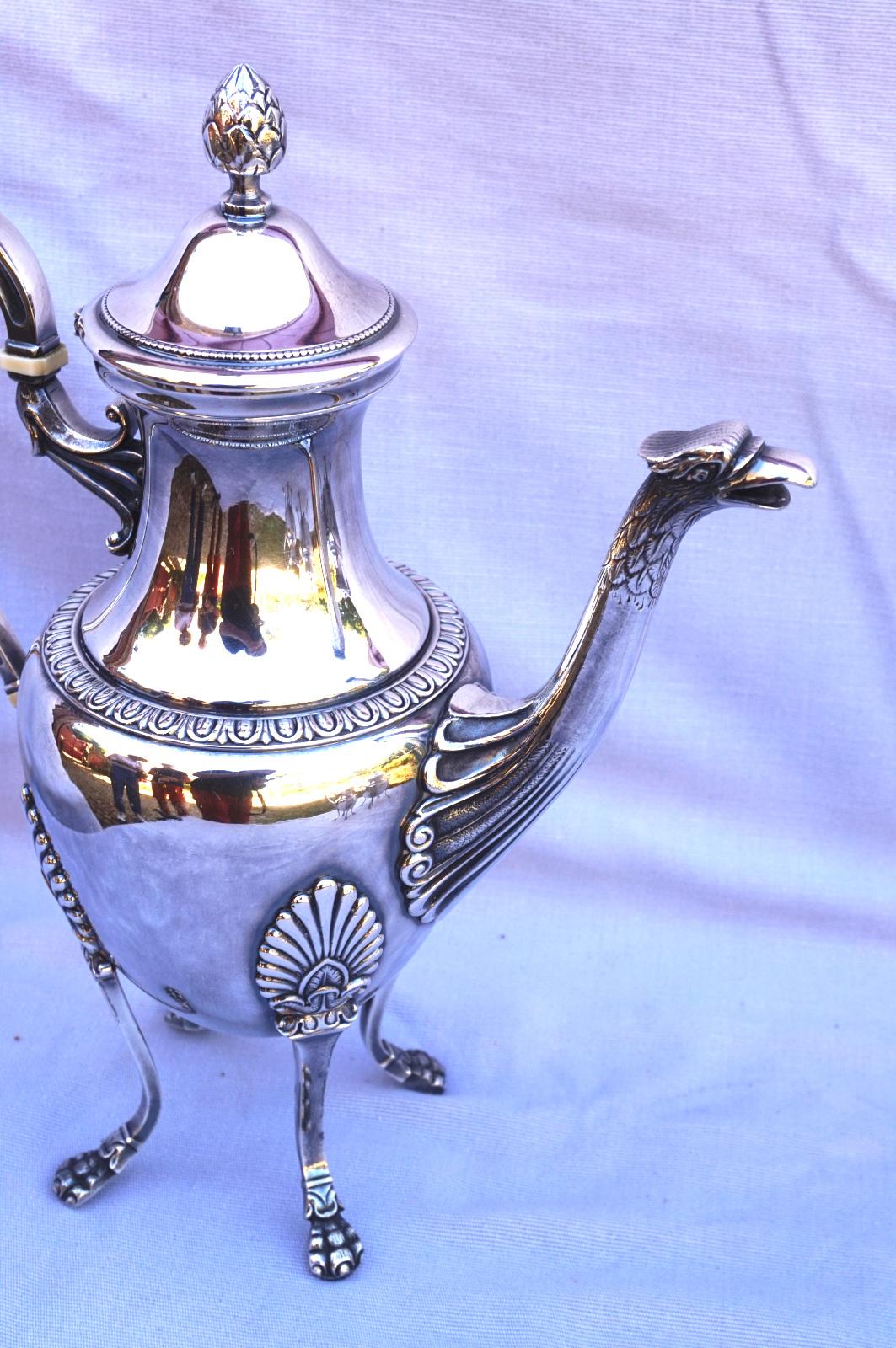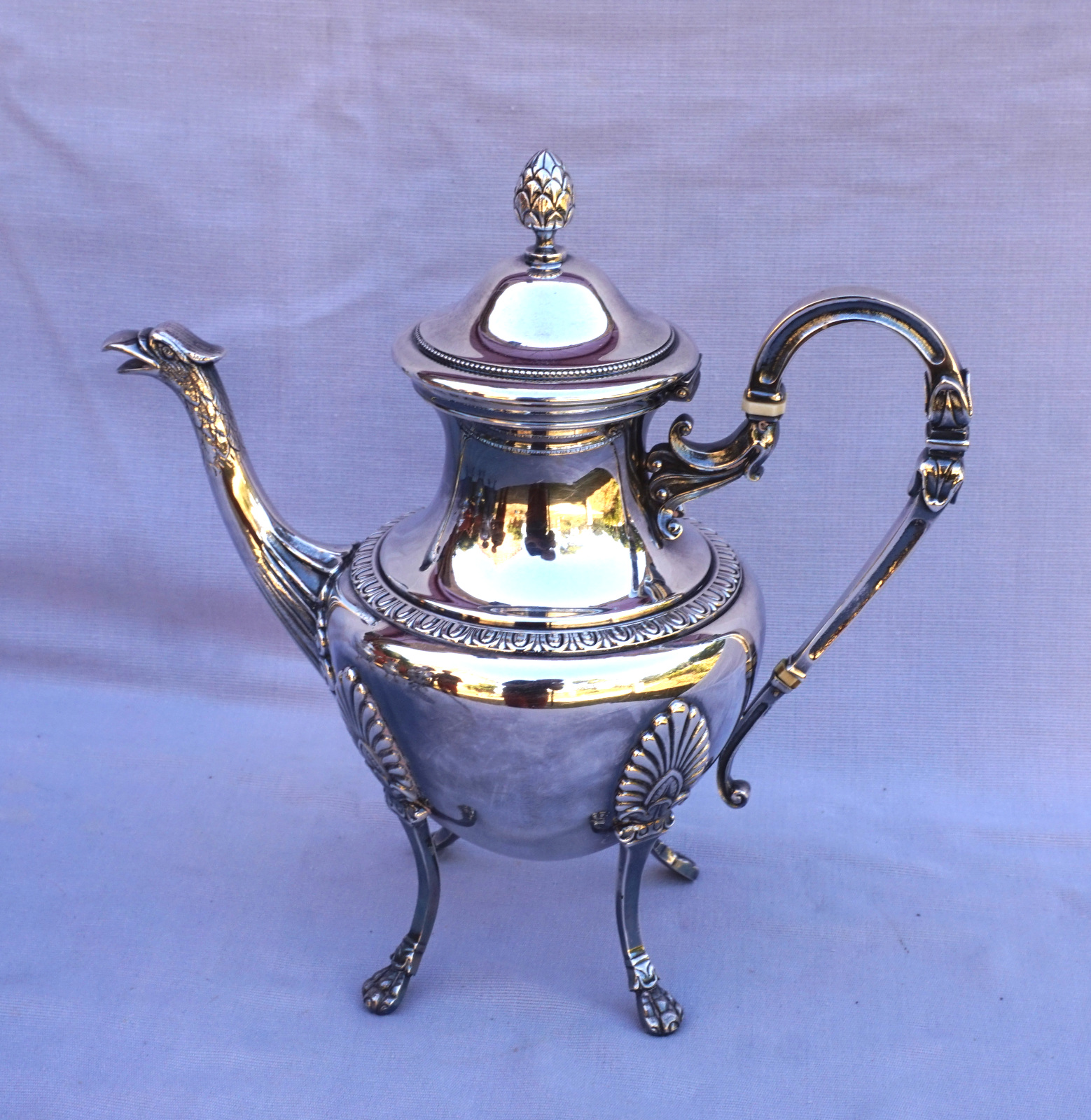 For our French-speaking friends Ensemble thé café de service sur plateau de style Empire, décor à tëte d'aigle et griffes de lion par Durousseau & Raynaud orfèvre à Lyon vers 1927. Toutes les pièces sont estampillées. Dimensions: pour le plateau 65 cm x 38.2 cm; pour la verseuse à café hauteur 30cm, largeur 27 cm, profondeur 12 cm, pour la théière hauteur 25cm, largeur 26 cm, profondeur 13 cm; pour le sucrier hauteur 21.5 cm, largeur 15.2 cm, profondeur 17.5 cm, pour le pot à lait hauteur 15 cm, largeur 12.5 cm, profondeur 8 cm, poids de l'ensemble 5.5 kg. Parfait état.