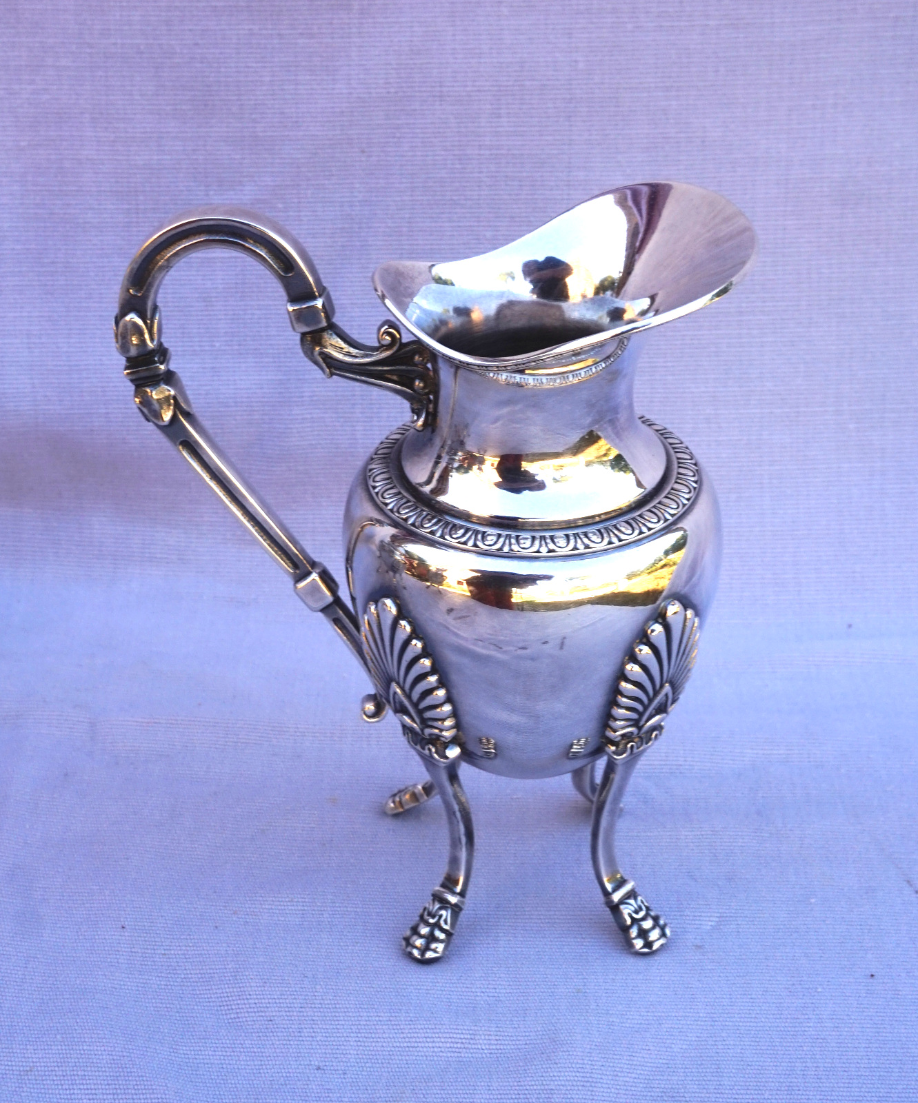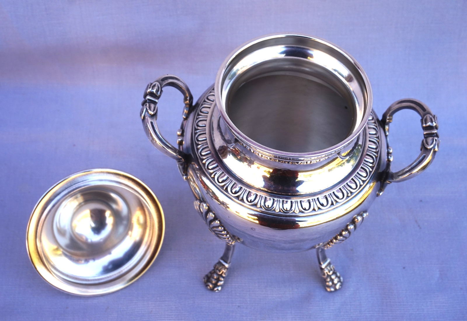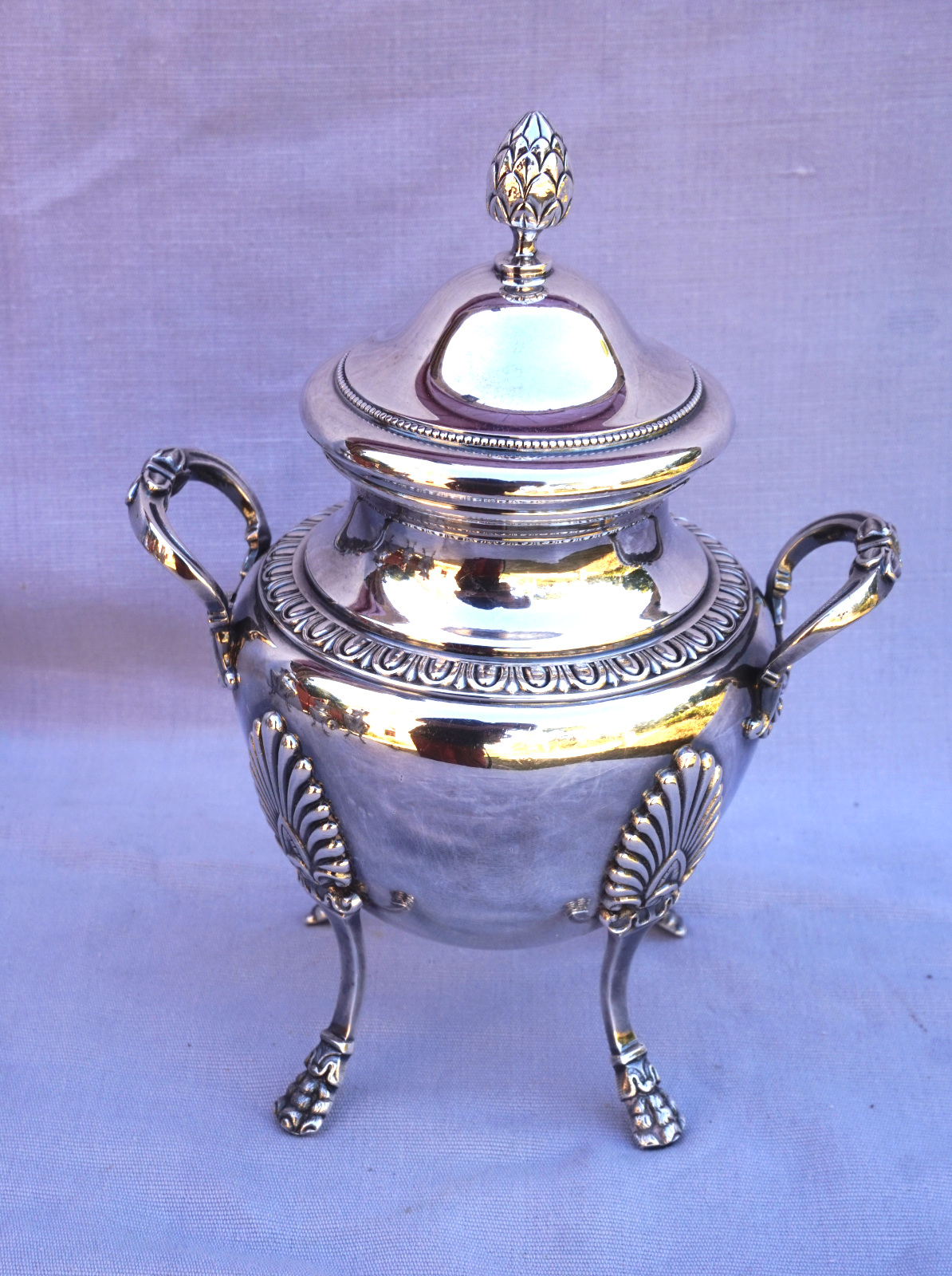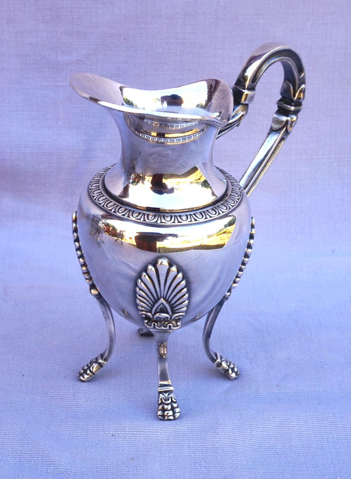 For our French-speaking friends Ensemble thé café de service sur plateau de style Empire, décor à tëte d'aigle et griffes de lion par Durousseau & Raynaud orfèvre à Lyon vers 1927. Toutes les pièces sont estampillées. Dimensions: pour le plateau 65 cm x 38.2 cm; pour la verseuse à café hauteur 30cm, largeur 27 cm, profondeur 12 cm, pour la théière hauteur 25cm, largeur 26 cm, profondeur 13 cm; pour le sucrier hauteur 21.5 cm, largeur 15.2 cm, profondeur 17.5 cm, pour le pot à lait hauteur 15 cm, largeur 12.5 cm, profondeur 8 cm, poids de l'ensemble 5.5 kg. Parfait état.
