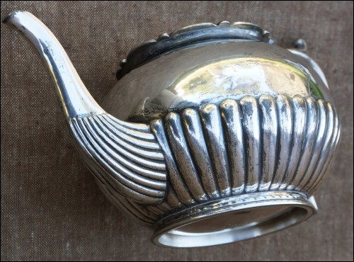 Théière en métal argenté de Richard Richardson, vers 1895. Élégant travail de Sheffield, la graine de préhension est en os. Bel état malgré l'usage, usure d'argenture. Hauteur 14 cm, longueur 25,5 cm.