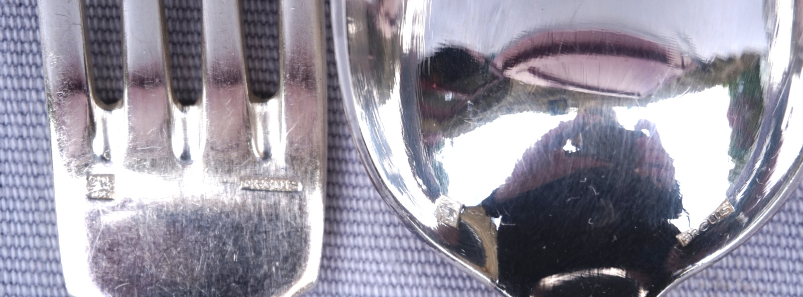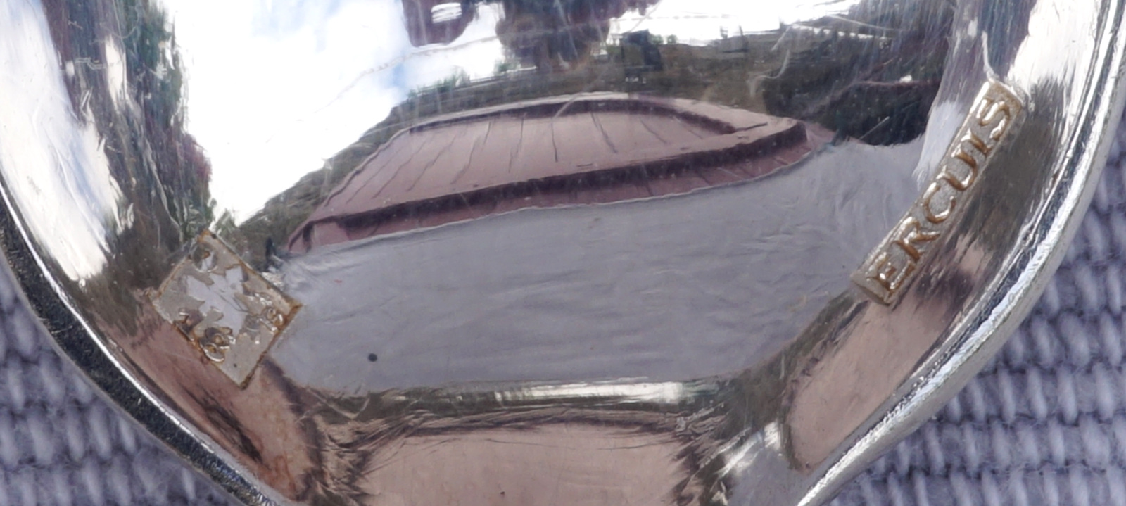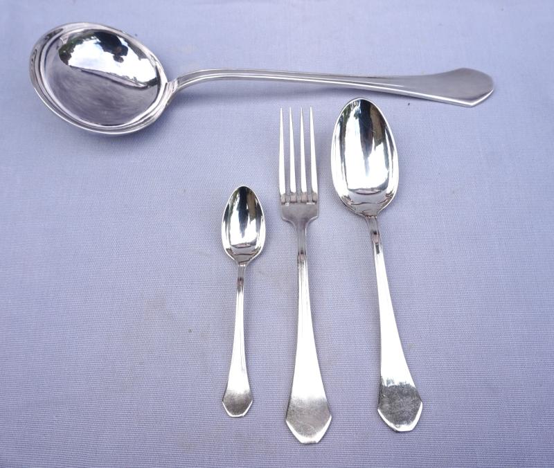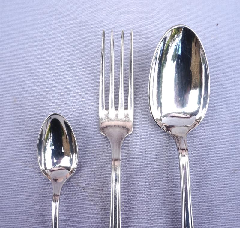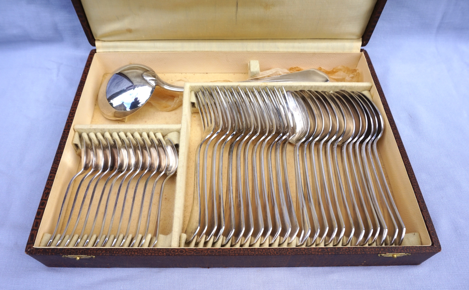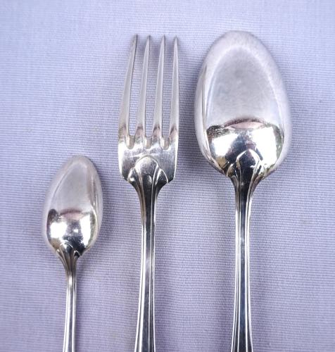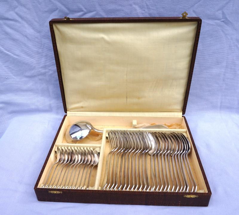 Ménagère en métal argenté de 37 pièces modèle Médicis par Ercuis France, vers 1925. Toutes les pièces sont estampillées. Longueur des fourchettes et cuillères de table 21 cm, cuillère dessert 14.2 cm. Très bel état, très peu d'usage.