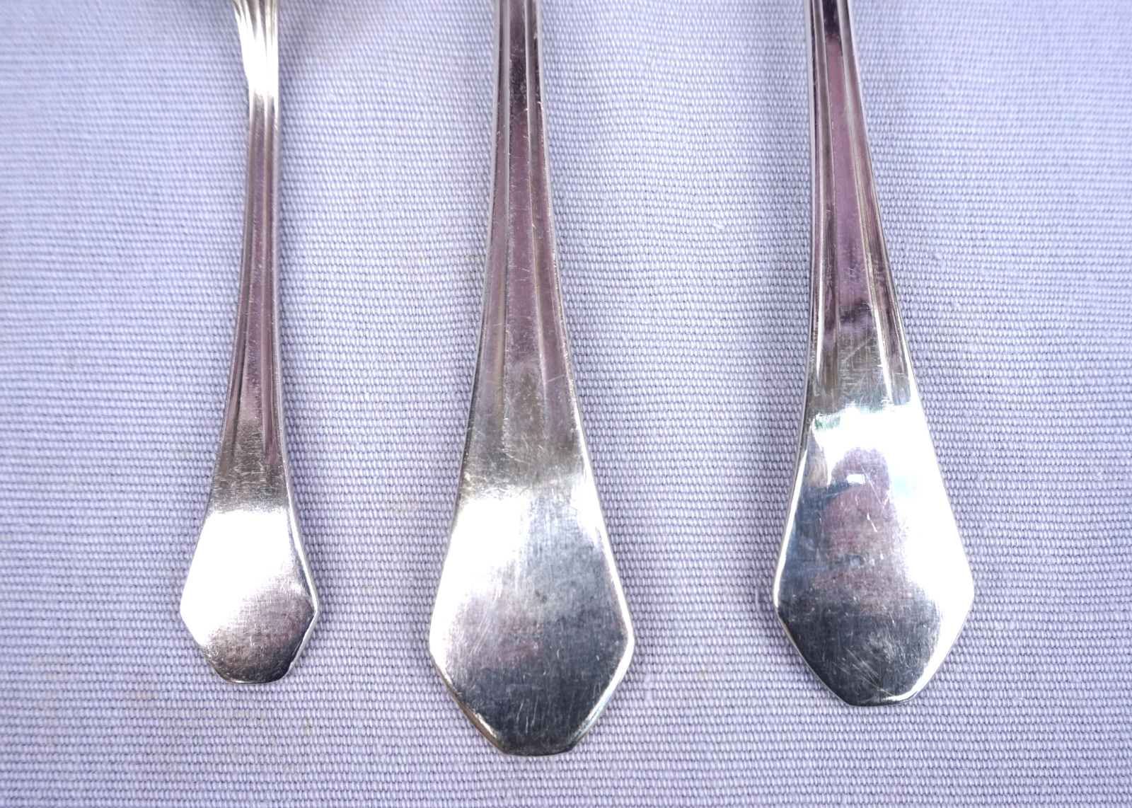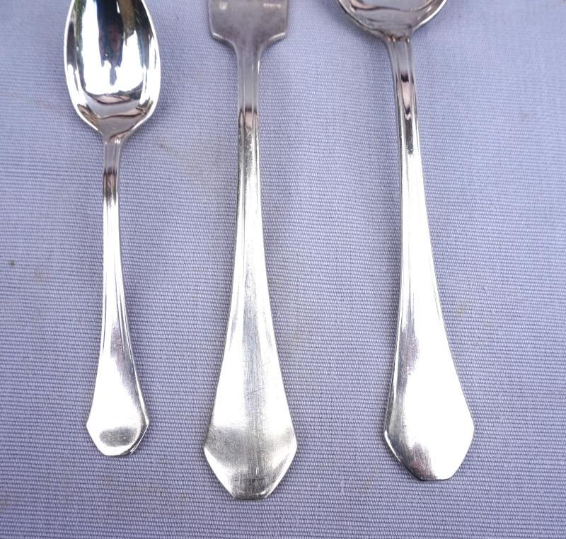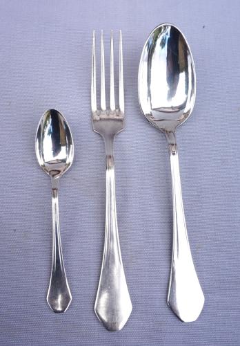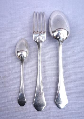 French Art Deco silver plate flatware Medicis model made by ERCUIS France during the 1925's. All the 37 pieces are hallmarked. 8 1/4" (21cm) length for dinner fork and spoon and 5 1/2" (14.2cm) length for dessert spoon. Beautiful condition.