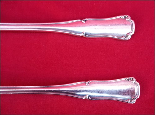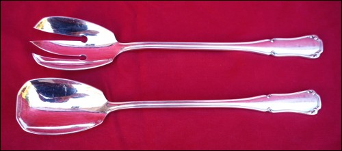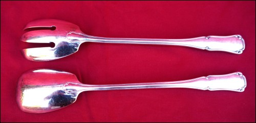 French silverplate salad serving set Valencay pattern in Louis XV style made by Ercuis France. They are hallmarked Ercuis and in their original box. 10" (25.5cm) length. Perfect condition as shown by the following pictures.