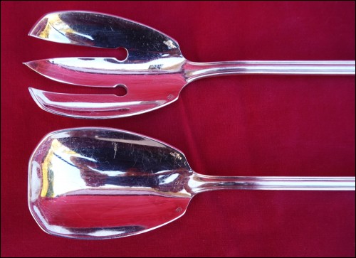 Couvert à salade en métal argenté modèle Valencay par Ercuis France. Ils sont estampillés de la marque et dans leur écrin d'origine. Longueur 25.5cm. Très bel état.