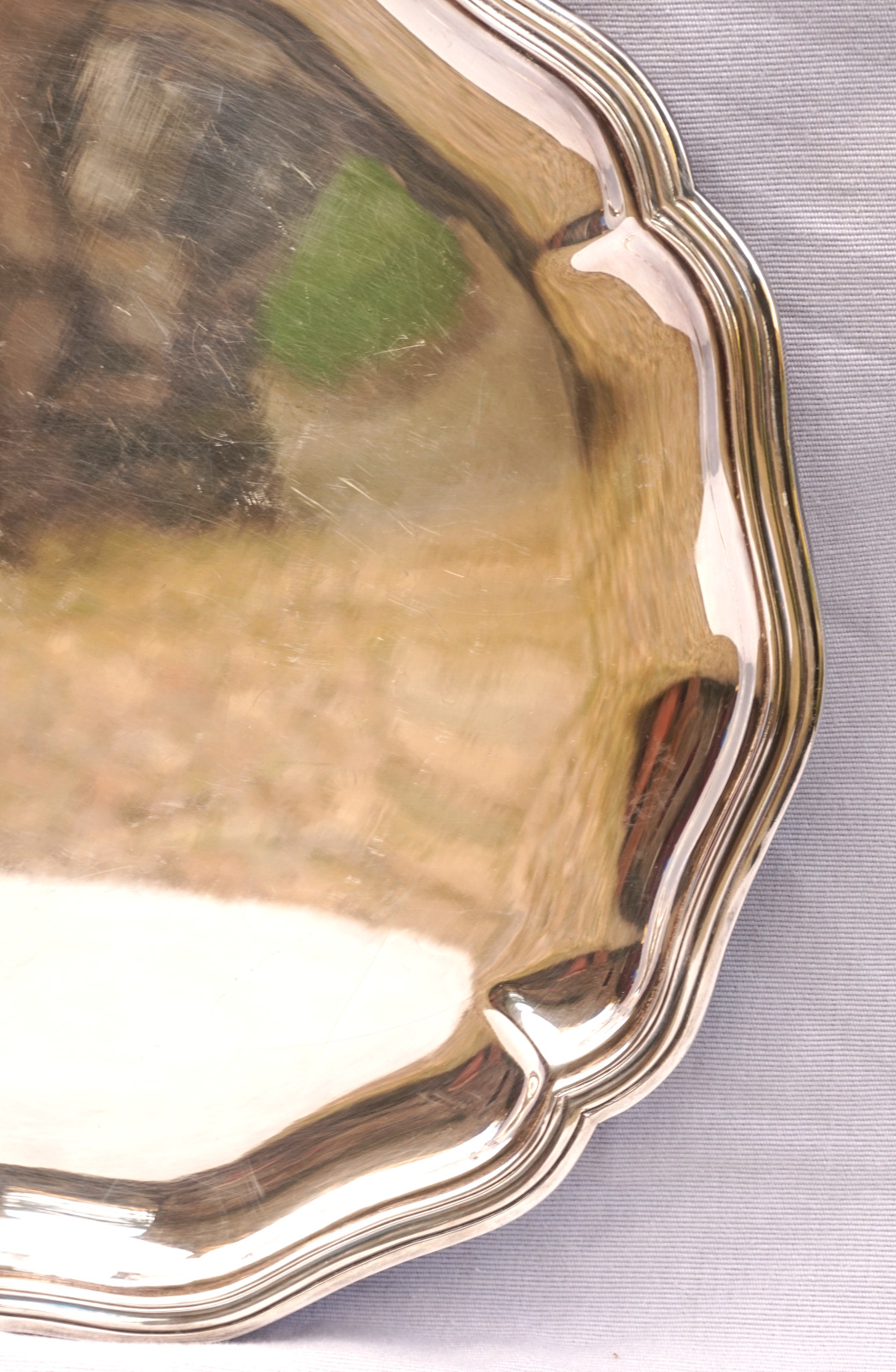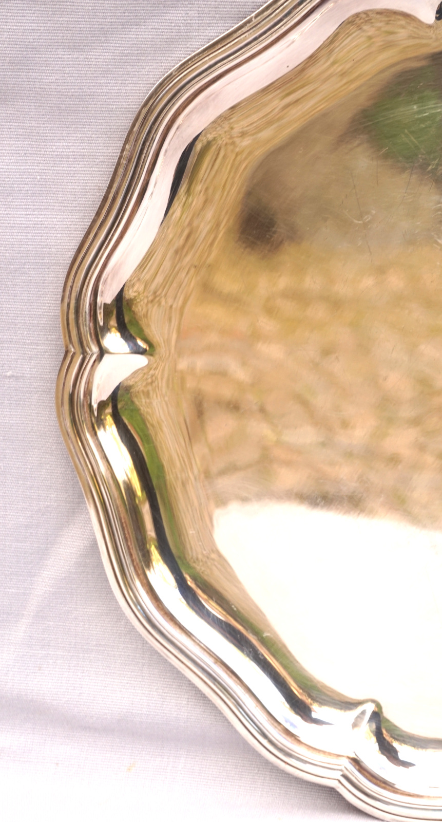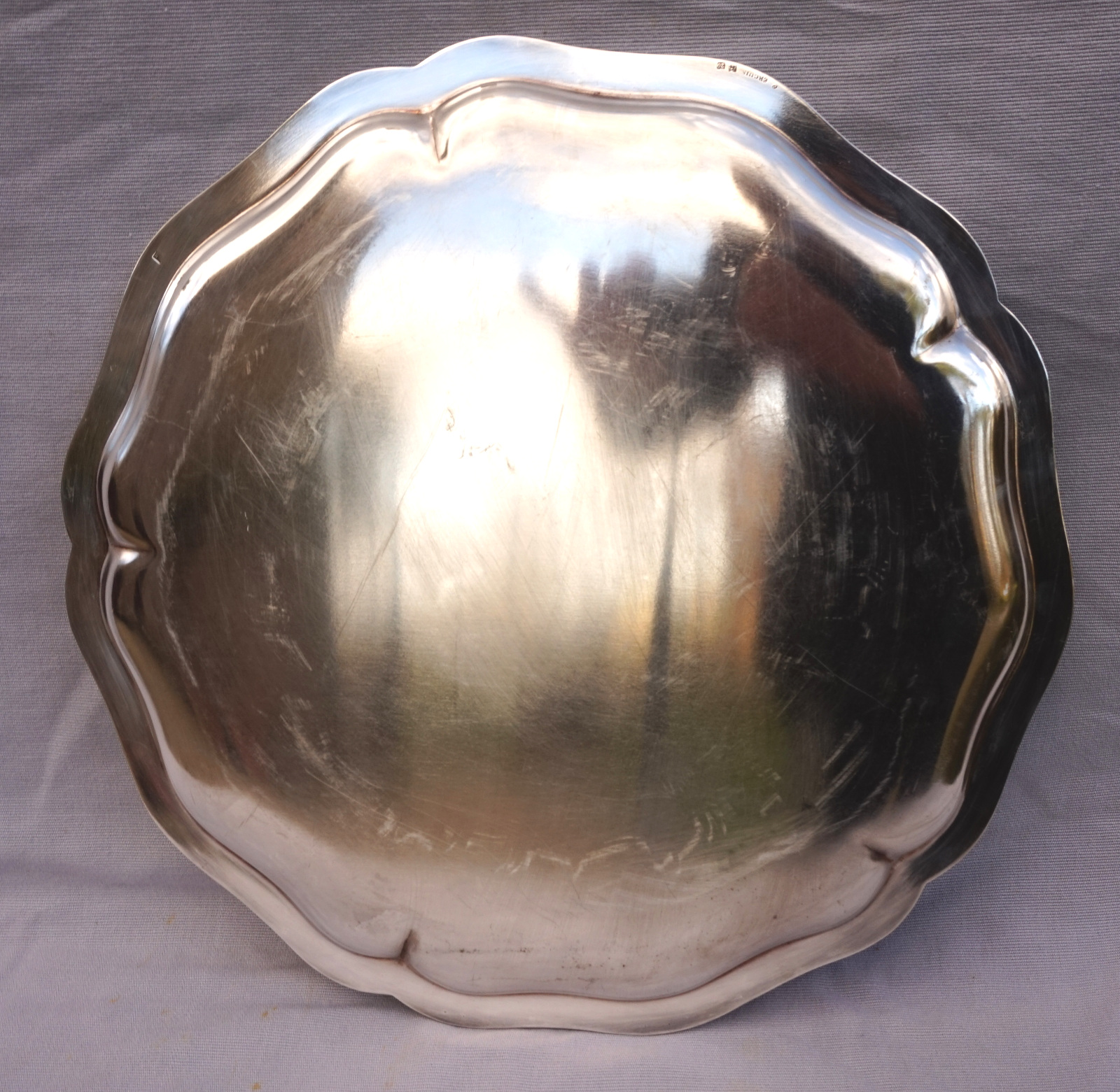 French silverplate scalloped serving tray in Louis XV Style made by Ercuis Paris. It's hallmarked on the back. 13 3/4" (34.8cm) diameter, weight 2lbs 9oz (1.187 kilograms). Beautiful condition a few small used as shown by the following pictures.