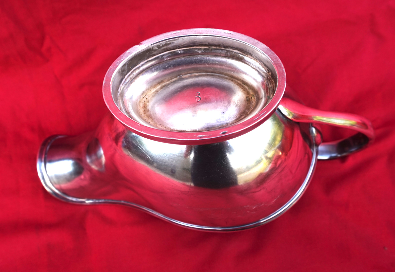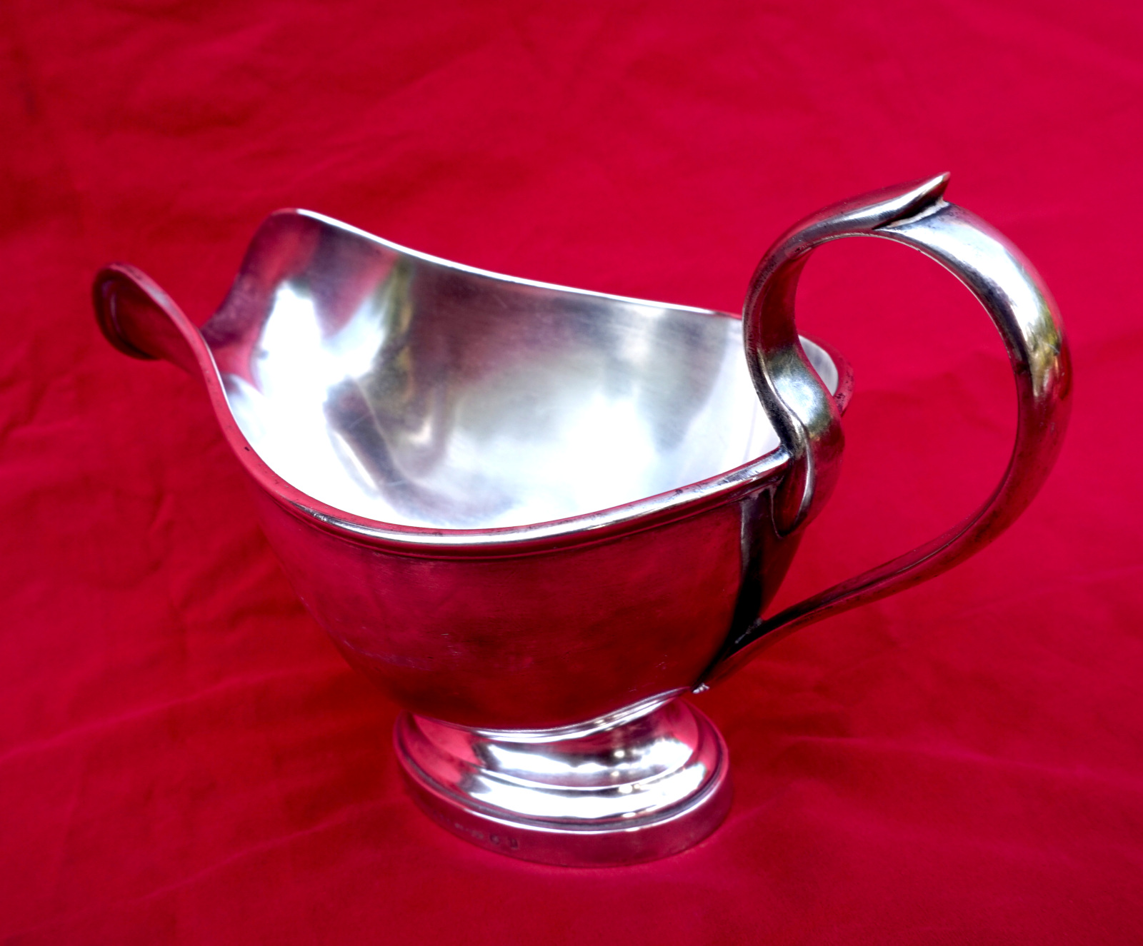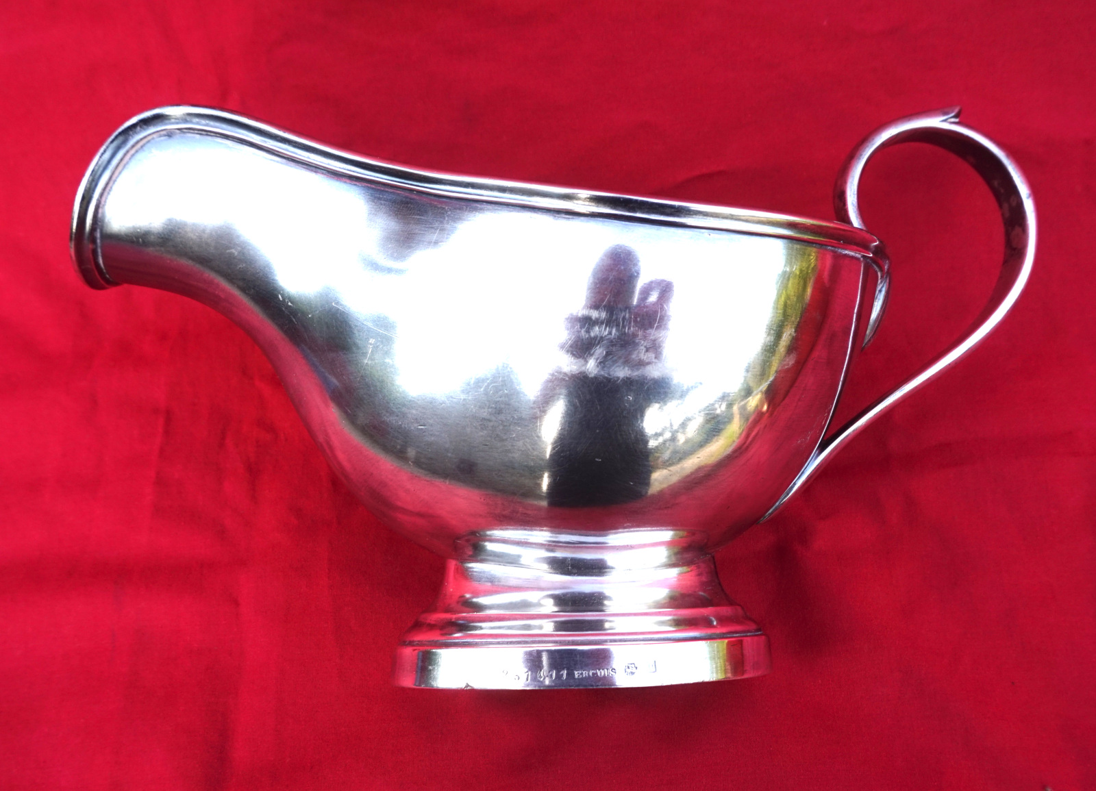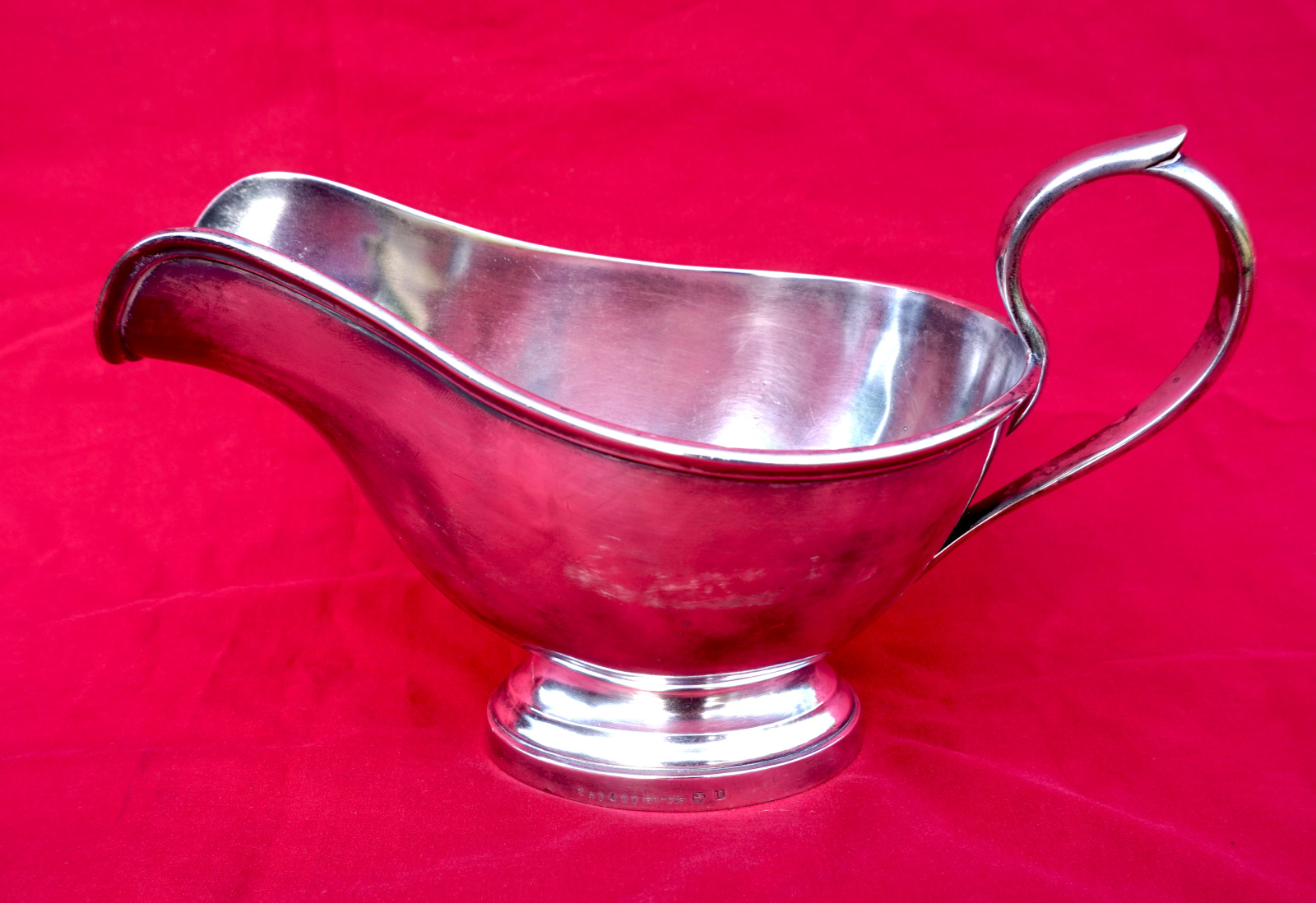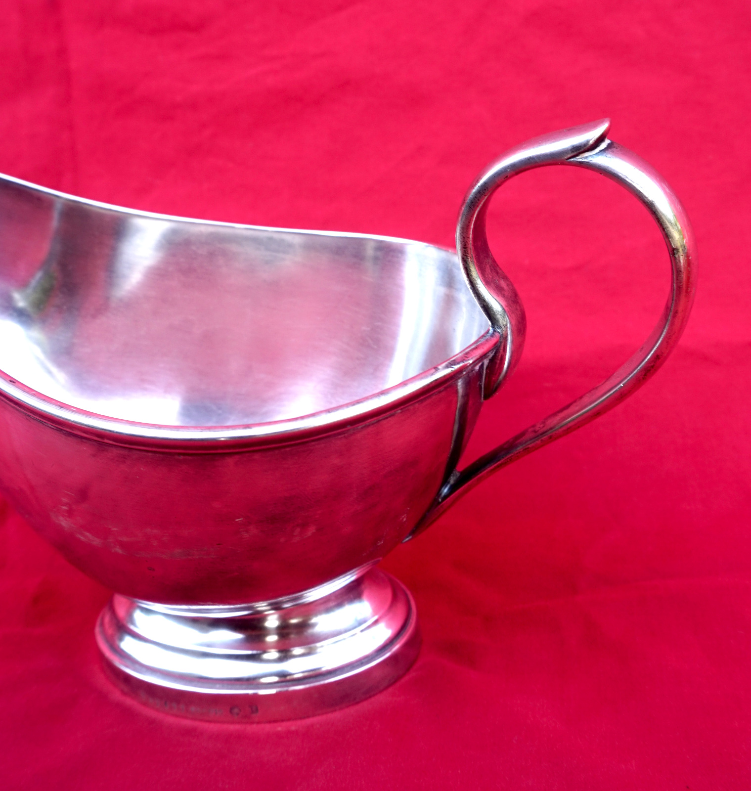 Saucière de restaurant en métal argenté par Ercuis. Elle est numérotée et poinçonné. Longueur 22 cm, largeur 11cm, hauteur 12.7 cm, poids 433 gr, contenance 40cl. Bel état, quelques tâches.