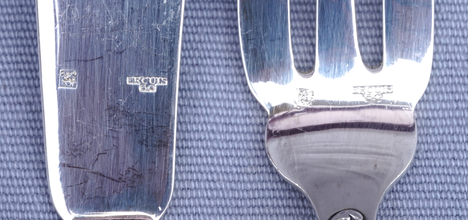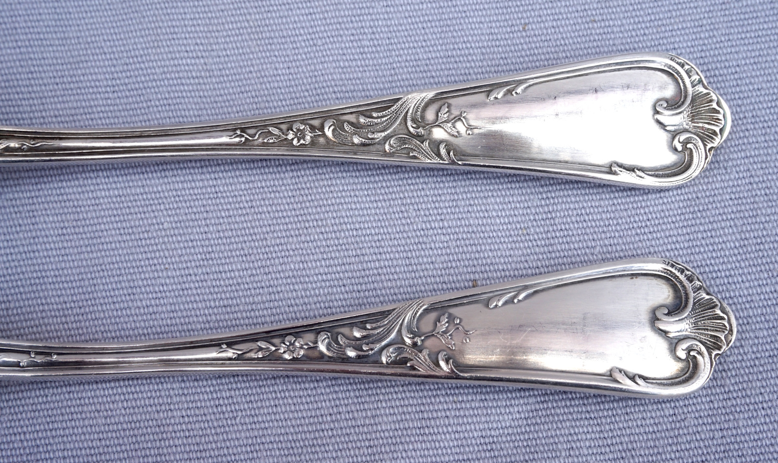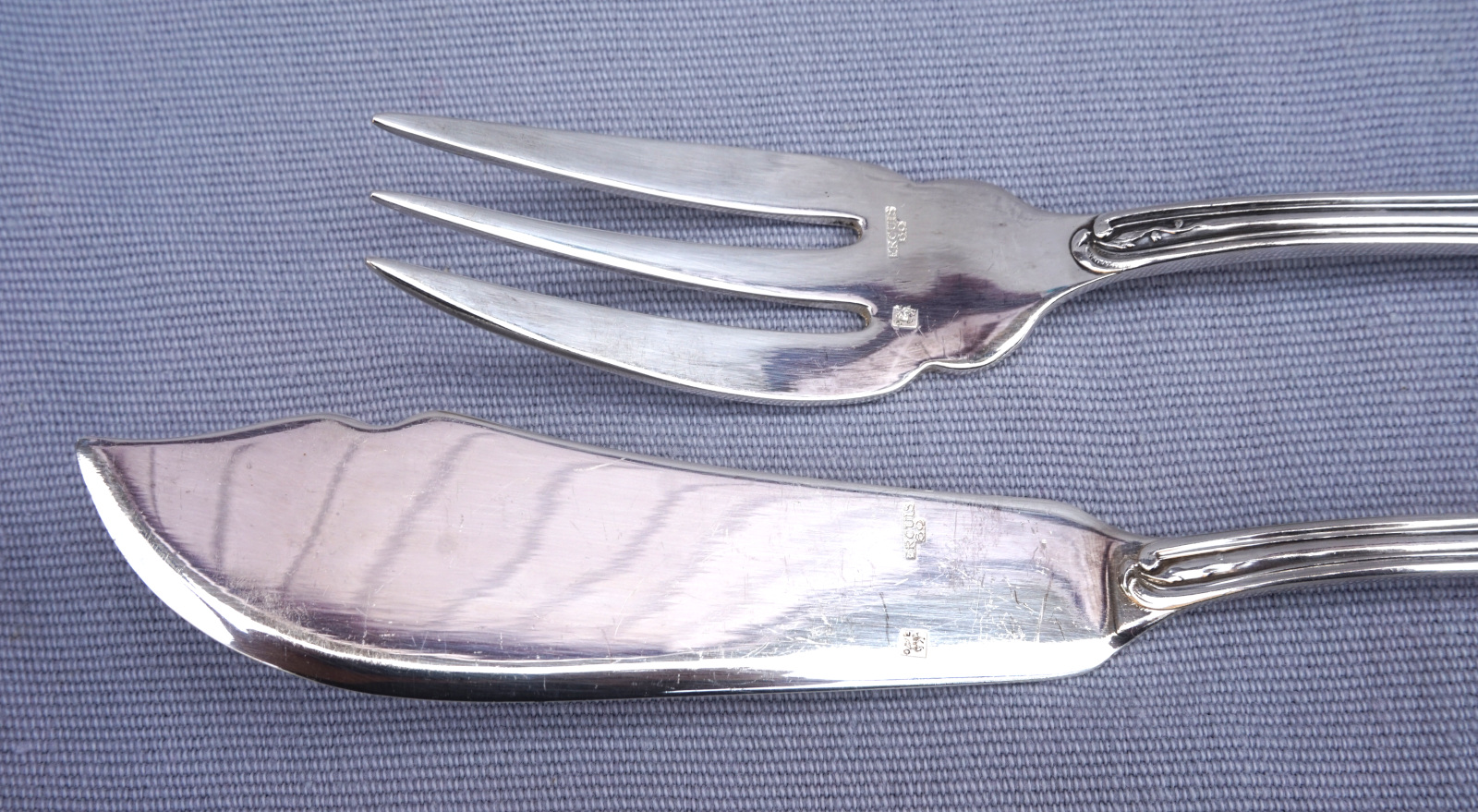 Ensemble de 3 couverts, fourchettes et couteaux, à poisson de style Louis XV rocaille en métal argenté par Ercuis. Tous les couverts sont poinçonnés de la marque Ercuis ainsi que du grammage. Longueur des couteaux 21.3 cm, pour les fourchettes 18.7 cm. Très bel état.