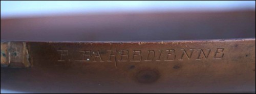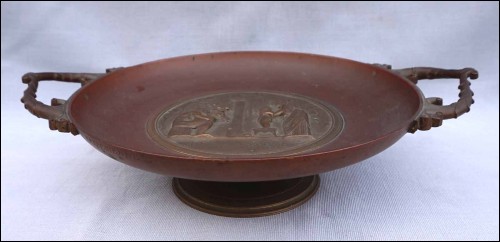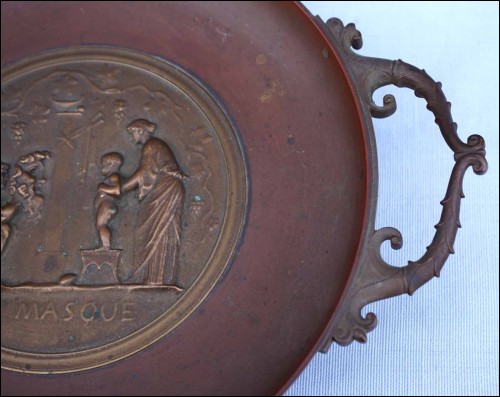 French patinated bronze tazza, footed dish, showing Le Masque (The Mask) from Levillain, by Ferdinand Barbedienne during the second half of the 19th century. It's signed on the edge. 13" (33cm) width with the ha,dles, 10" 25.5cm) diameter, 3 1/2" (9cm) height. Beautiful condition a few small stains on the patina as shown by the following pictures.