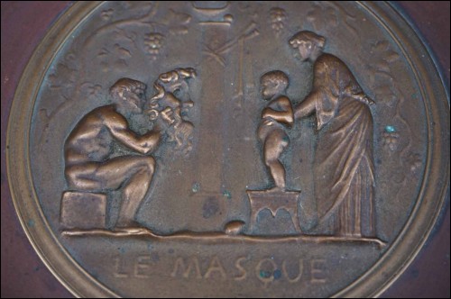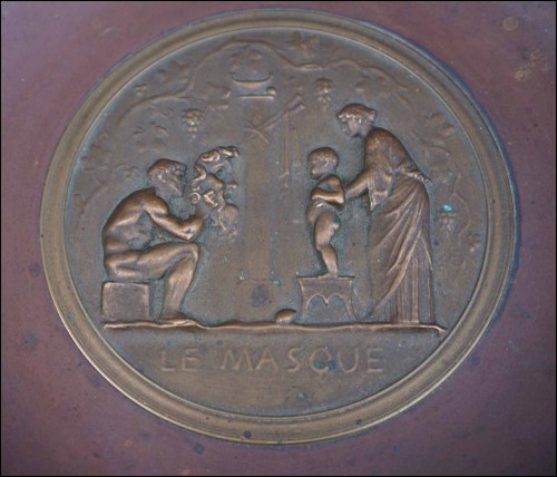 Le Masque, d'après F. Levillain, coupe Tazza à la grecque à patine médaille de Ferdinand Barbedienne, deuxième moitié du XIXe siècle. Légère taches sur la patine, bel état. Signé Ferdinand Barbedienne. Hauteur 9 cm, largeur 33 cm, diamètre 25,5 cm.