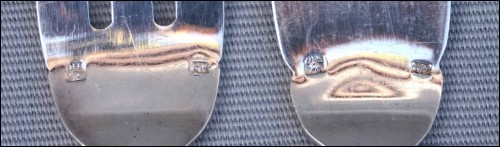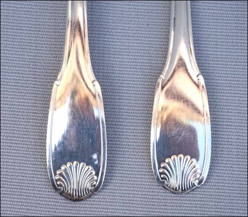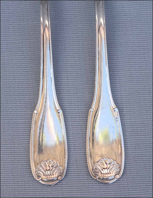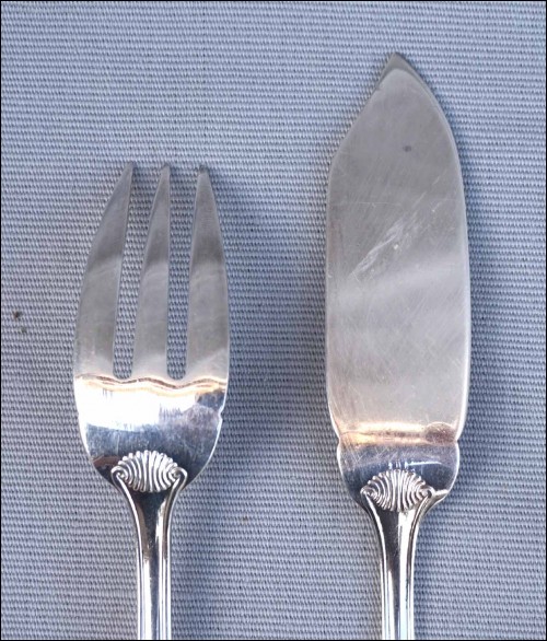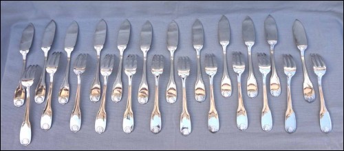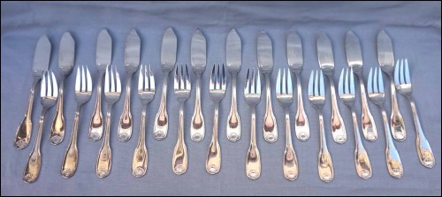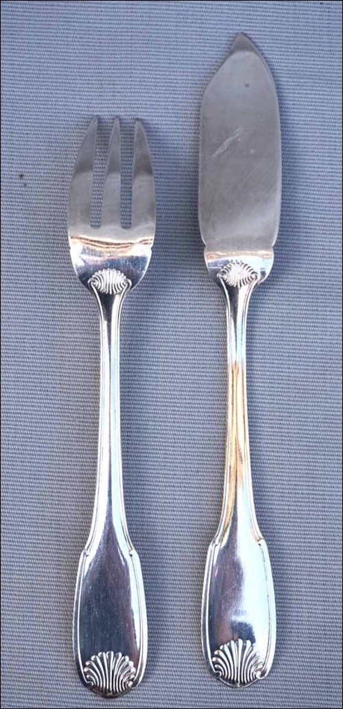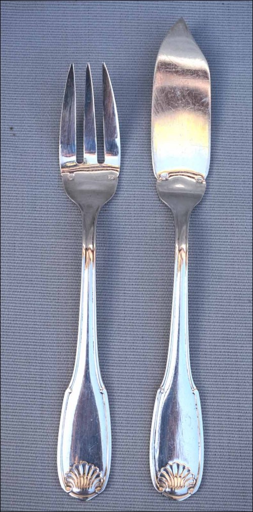 French Ercuis silver plate fish flatware , 12 forks and knives set, shell coquille model in Louis XV style. They are hallmarked. 8 1/4" (21cm) length for the knife and 7 1/4" (18.5cm) for the fork. Good condition as shown by the following pictures.