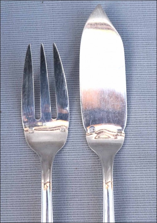 Ensemble de 12 couverts à poisson, fourchettes et couteaux, en métal argenté. Longueur du couteau 21cm, de la fourchette 18.5 cm. Très bel état.