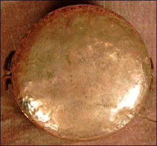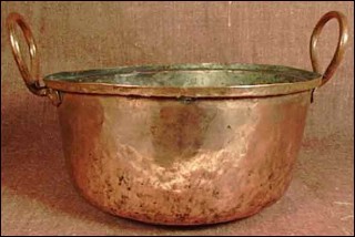 This caldron with fixed rings in copper tinned inside has been made in France around 1850. Good condition only a small tear on the edge as you can see on the picture below. 9"1/2diameter 4"1/2 tall without handles.