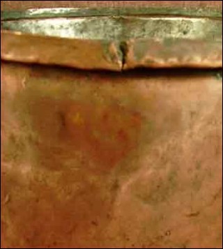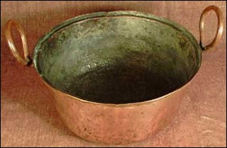 Chaudron en cuivre à oreilles fixes vers 1850. Il a perdu son couvercle. Bon état malgré une déchirure sur le bord. Hauteur sans anses 11,5 cm, diamètre 24,5 cm.