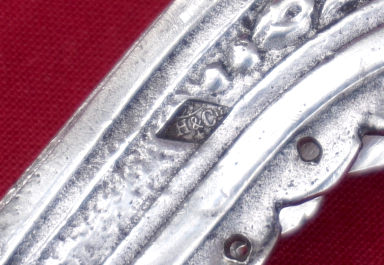 Fermoir de sac avec clips de fermeture en agent massif par Hénin et Cie (1896-1901) 77 rue des archives Paris. Il est poinçonné à la Minerve et de la marque de l'orfèvre. Largeur 16 cm, épaisseur 8 mm, poids 109 gr. Très bel état.