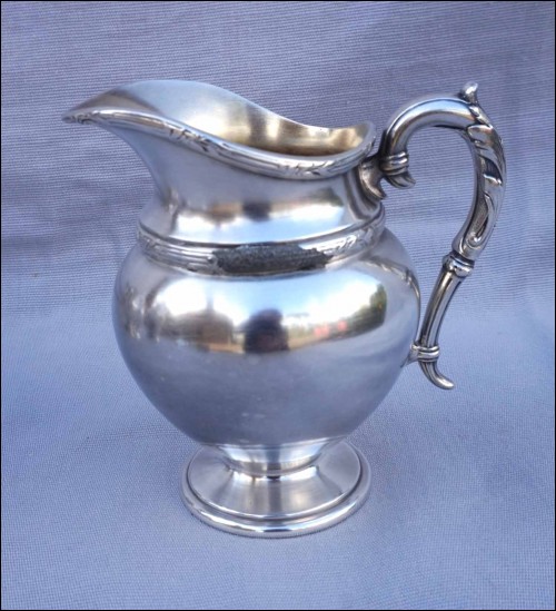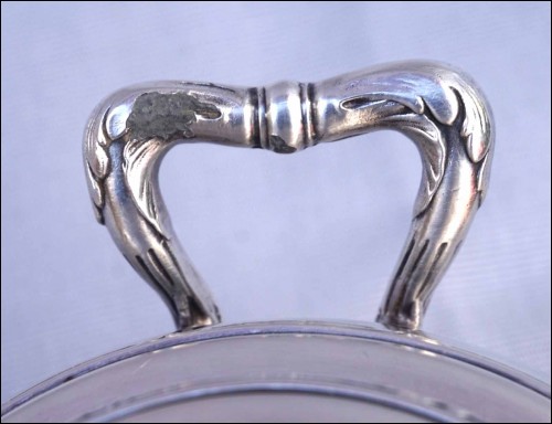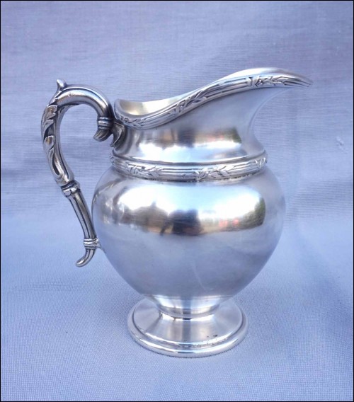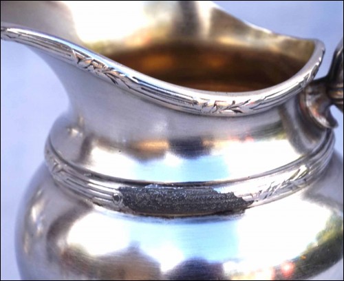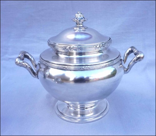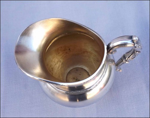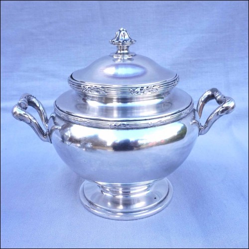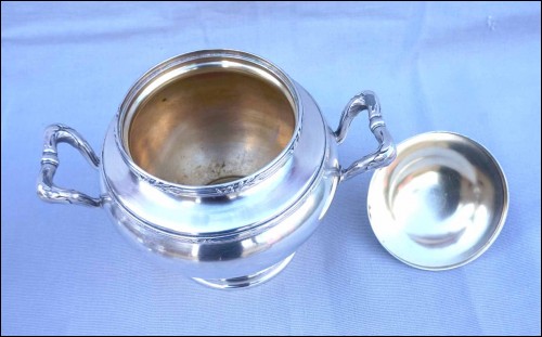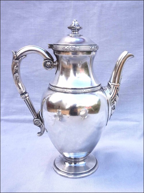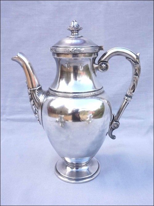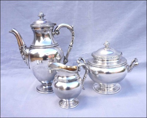French silverplate coffee set, coffee pot, sugar pot and creamer, with ribbons decor made by Gallia Paris during the 1900's. They are hallmarked and numbered on the bottom. They measures for the coffe pot 9 78" (25cm) height by 7 7/8" (20cm) width, for the sugar pot 6 1/4" (16cm) height by 7 7/8" (20cm) width and for the creamer 4 1/4" (11cm) height by 4 1/4" (11cm) width. Good condition, oxydation stains as shown by the following pictures.