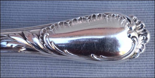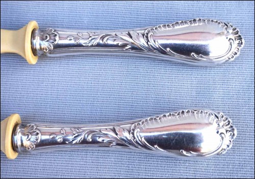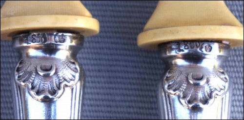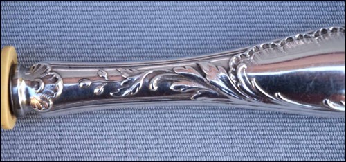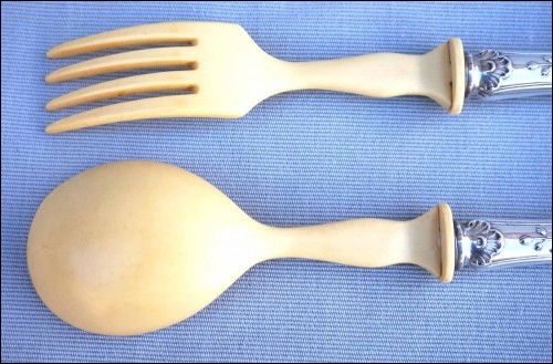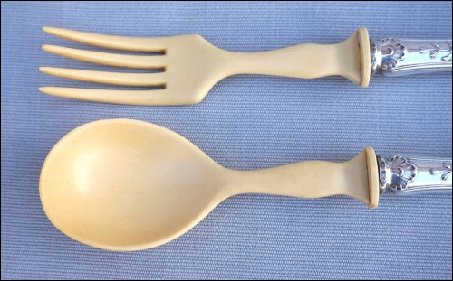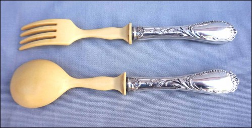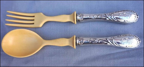 Couvert à salade , manche argent massif fourré, monogramme BM, fourchette et cuillère en celluloïde, par Koch & Bergfeld à partir de 1884. Ils sont poinçonnés du maître orfèvre et de la garantie. Longueur pour la fourchette 24.2 cm, la cuiller 23.5 cm, poids 129 gr. Bel état, un peu de jeu dans un emmanchement.