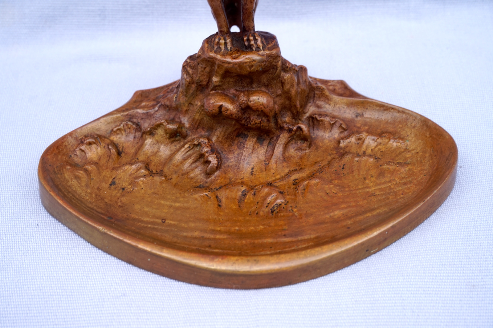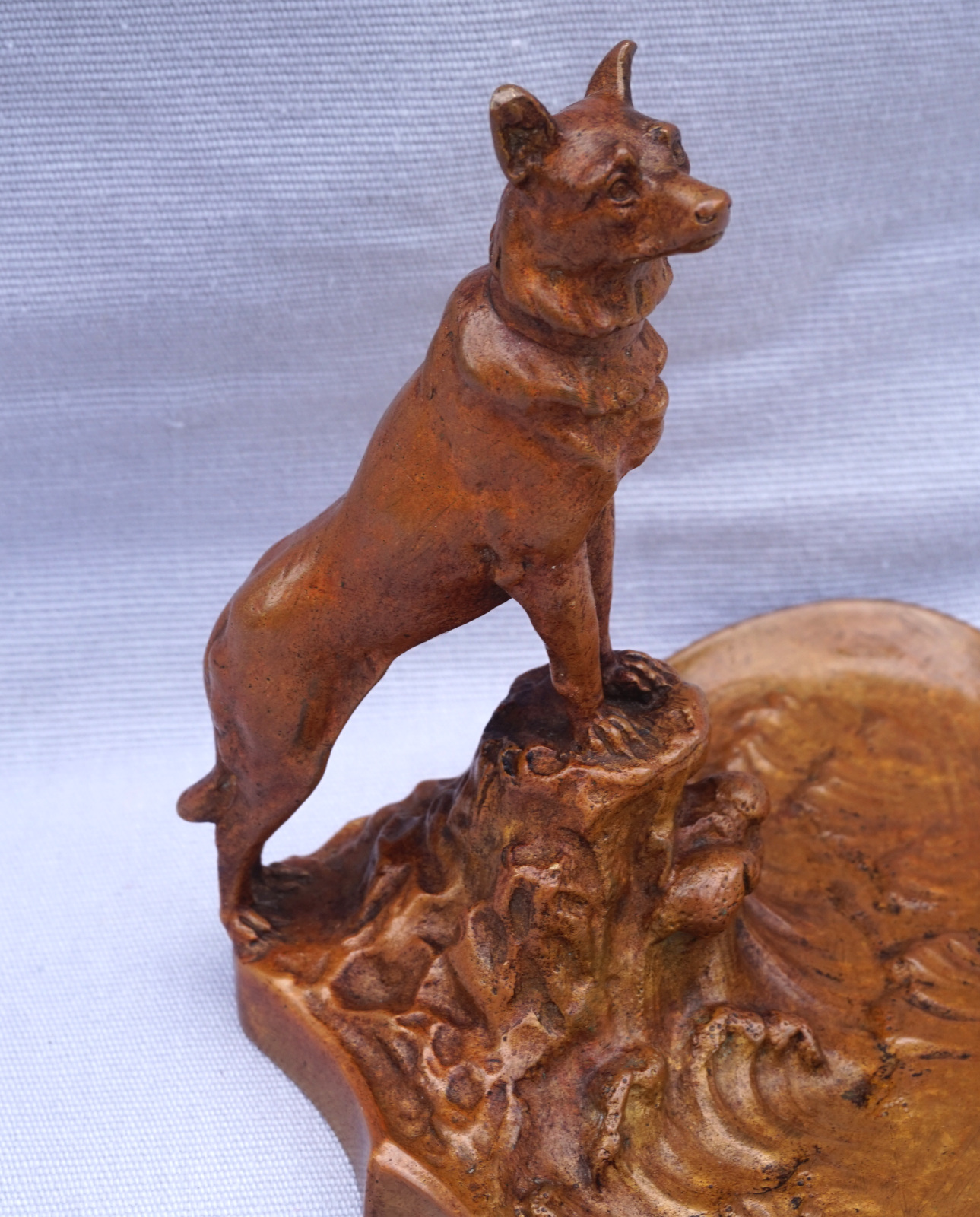 Vide poche de bureau en bronze orné d'un chien de berger suisse, vers 1900. Largeur 14 cm, profondeur 12 cm, hauteur 12 cm, poids 750gr. Bel état, patine médaille.