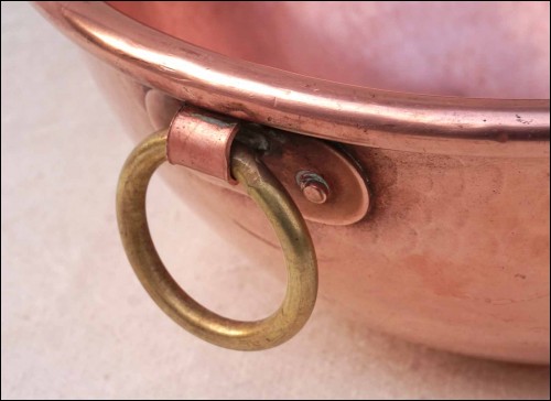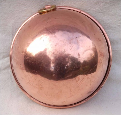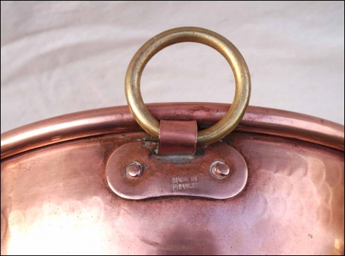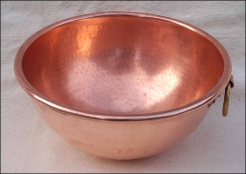 French hammered copper mixing whipping bowl with ring for hanging for chocolate , white egg, candy jelly with bronze ring for hanging made during the 1950's. 5 1/2" (14cm) height 10 3/8" (26.2cm) diameter, weight 2lb 10.11oz (1.194 kilogram). Perfect condition no bumps, a few small stains, as shown by the following pictures.
