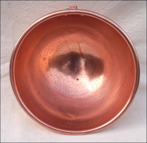 Cul rond pour cuire le sucre de grande cuisine en cuivre martelé, avec son anneau d'accroche, vers 1950. Hauteur 14 cm, diamètre 26,2 cm, poids 1.194kg. Parfait état.
