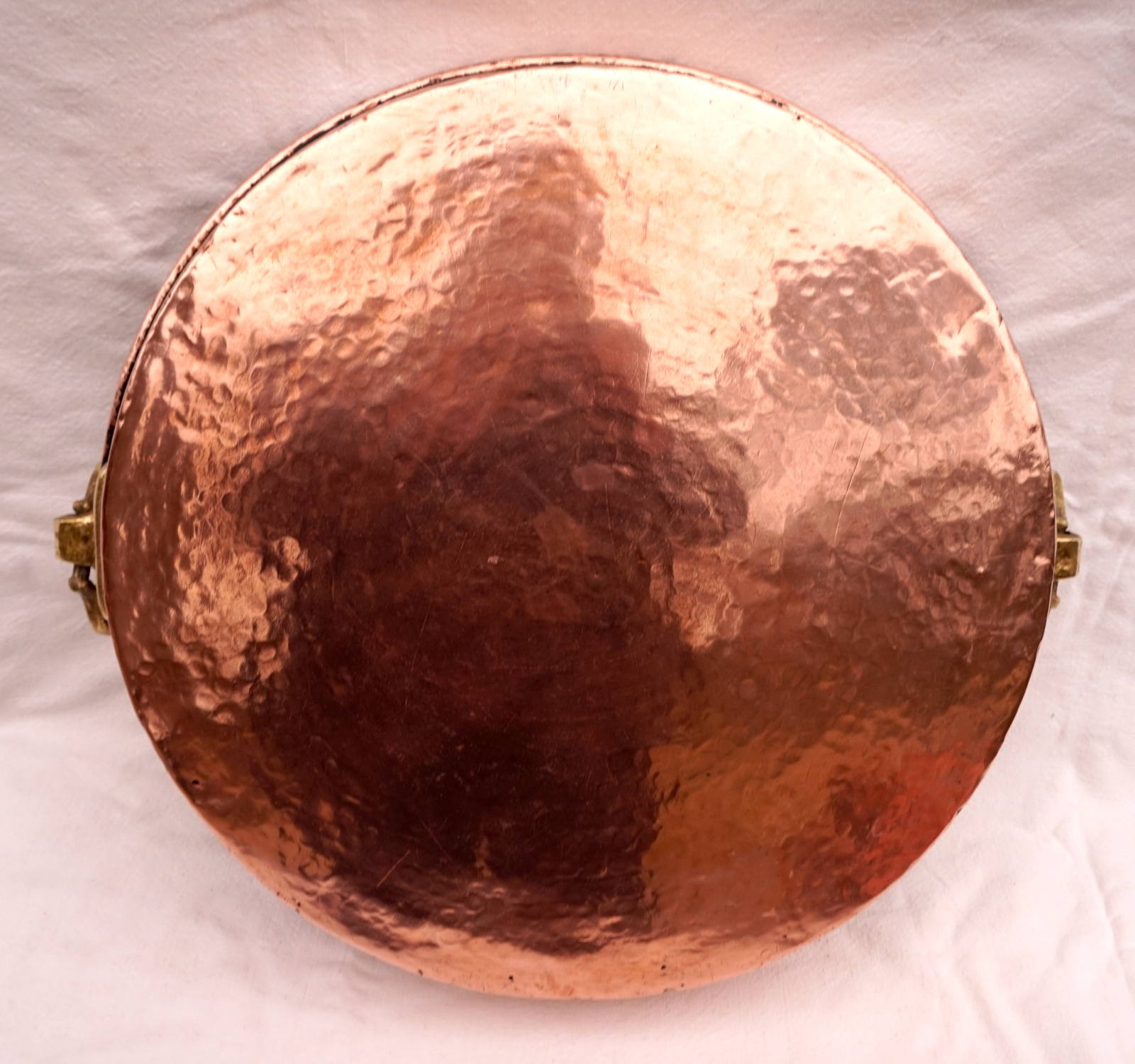 Grand plat rond à bord et anses laiton en cuivre martelé anciennemnt étamé deuxième moitié du XIXe siècle. DIamètre 42 cm, hauteur 7 cm, poids 2.013 kg. Très bel état.