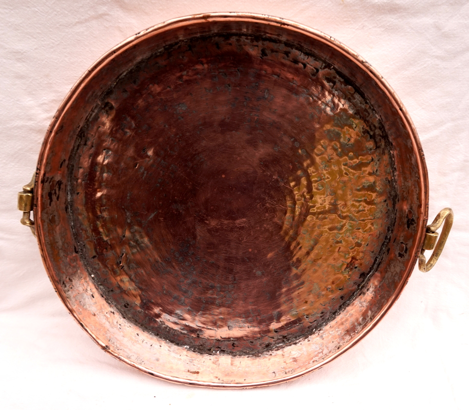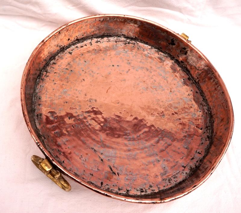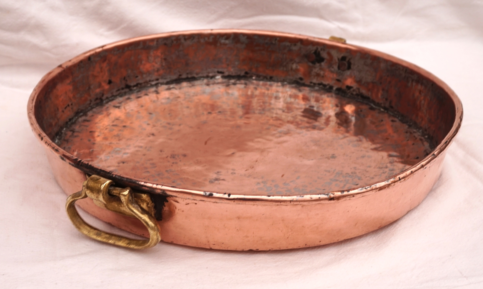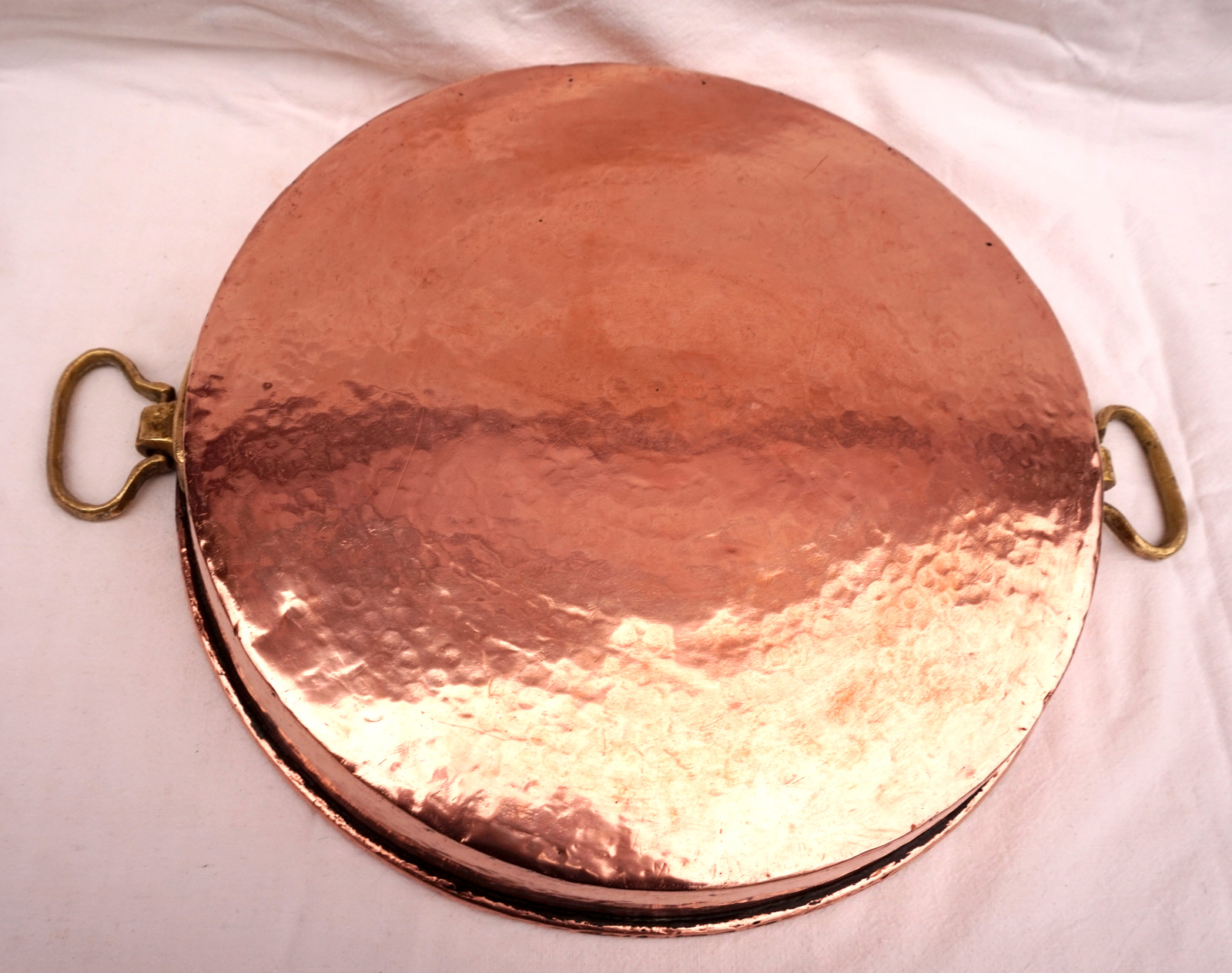 Hammered Copper Large Ø 16 1/2" Round Dish Baking Brass Handle 19th C