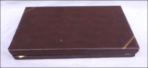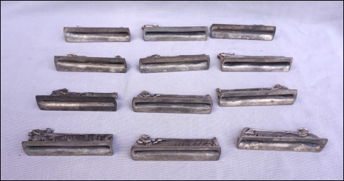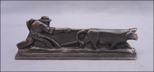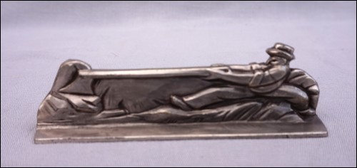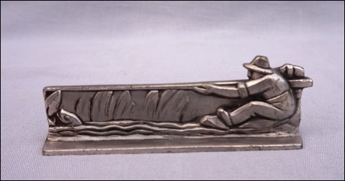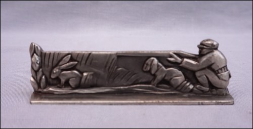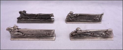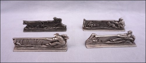 Ensemble de porte-couteaux en métal argenté représentant les travaux humoristiques du fermier, pêcheur et chasseur, d'après Benjamin Rabier vers 1930. Longueur 10.5 cm, hauteur 3.7 cm., poids 2.147 kg. Bel état, quelques taches, l'écran est usé.
