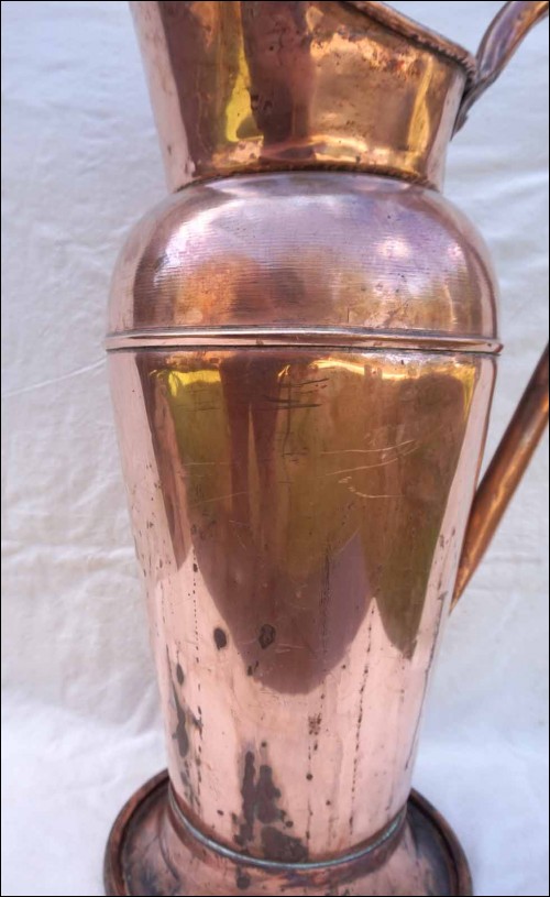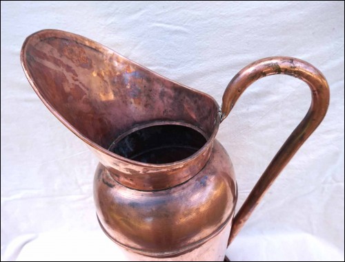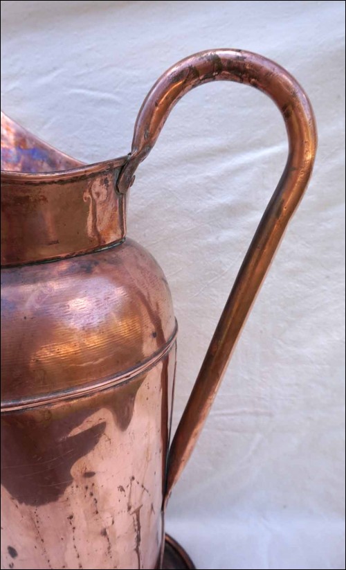 Grand broc de porteur d'eau pour bain en cuivre de la deuxième moitié du XIXe siècle. Très bel état, chocs d'usage. Hauteur 62 cm, diamètre à la base 24,5 cm, poids 4.430 Kg.
