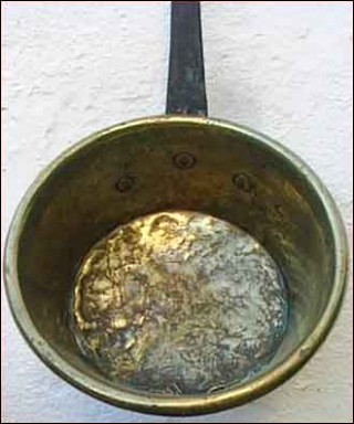 Louche ou cuillère à sirop en laiton, vers 1850. Elle possède un long manche en fer forgé d'un seul pièce. Bon état une petite déchirure dans le fond. Longueur 1,10 m, diamètre 22,5 cm