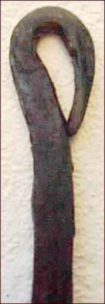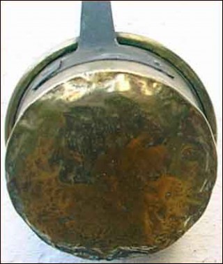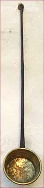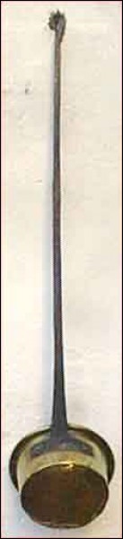 Laddle in brass made about 1850. It has a long handle in wrought iron with hole for hanging. Good condition only a small chip on the bottom of the ladle. 43" length, 9" diameter.