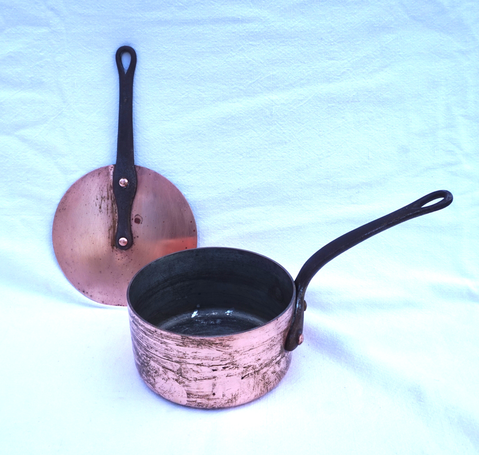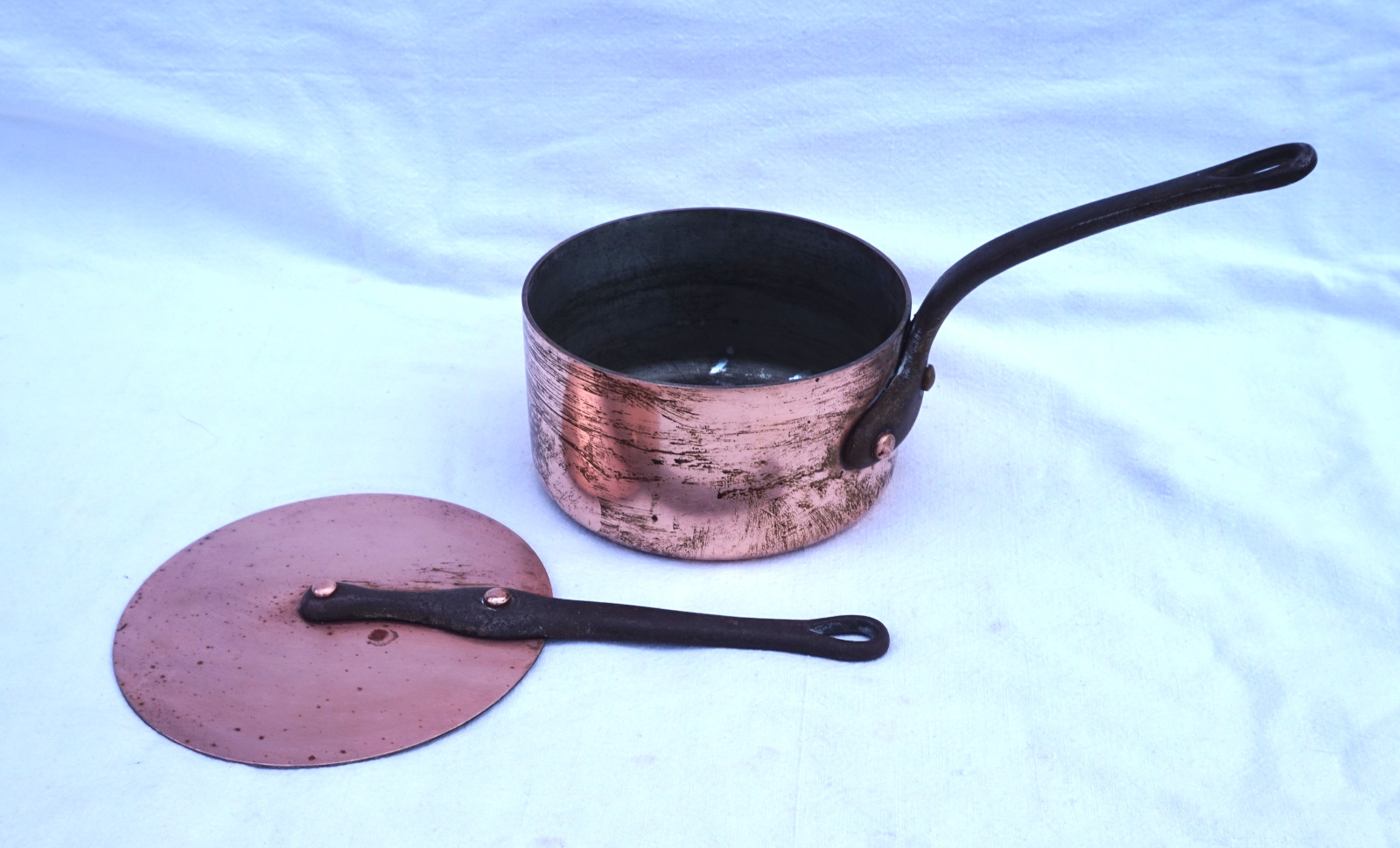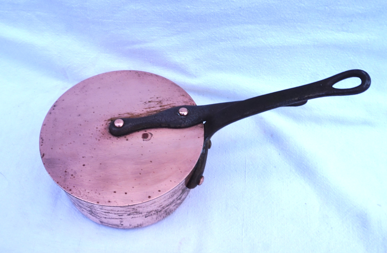 Casserole à couvercle en cuivre étamé pour le service des sauces, beurre et flambage.. Diamètre 14.2 cm, largeur avec l'anse 28 cm, hauteur sans le couvercle 7.5 cm, volume 1 l, poids total 1.360 kg, épaisseur 2 mm, contenance 0.25 l. Parfait état.