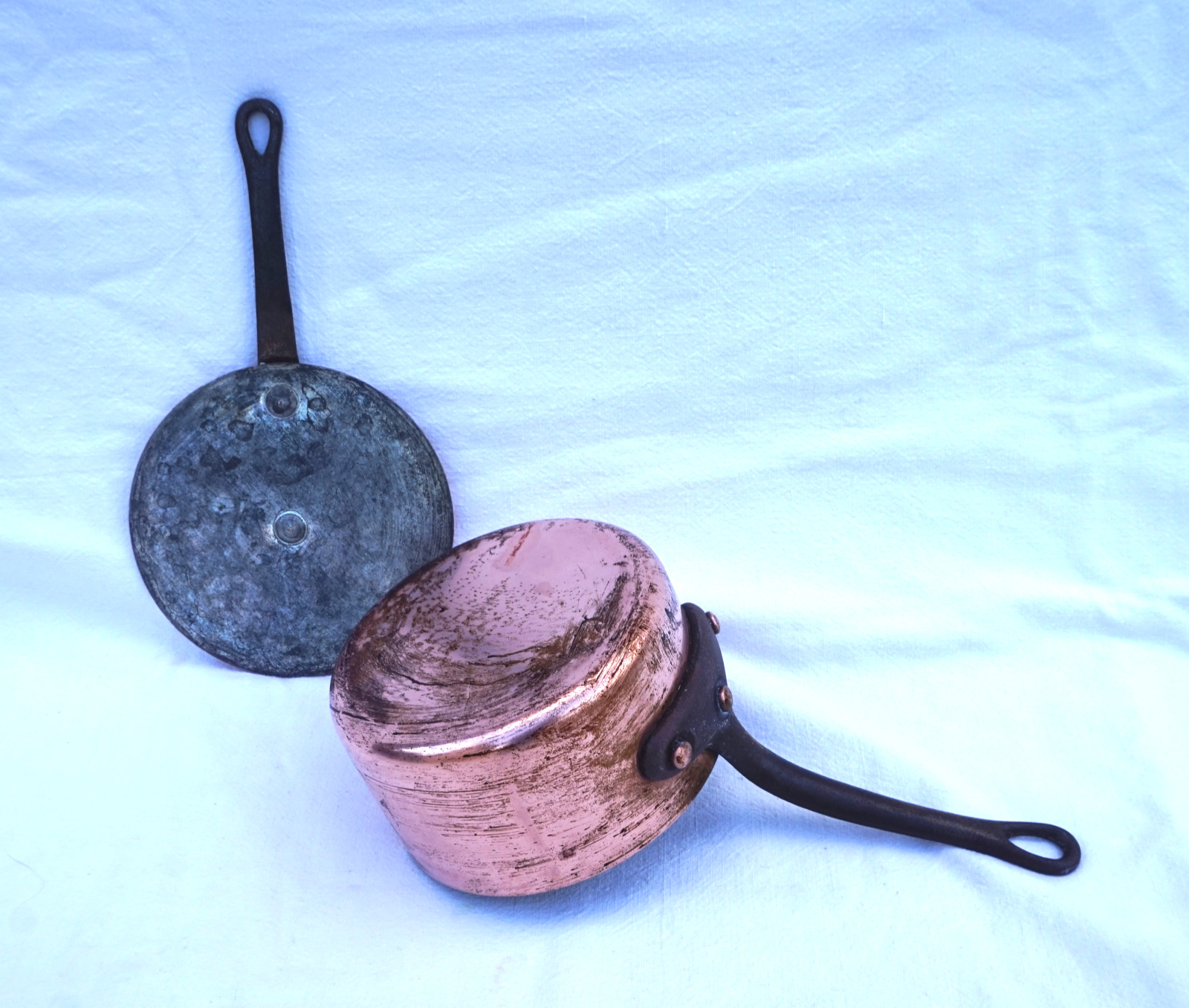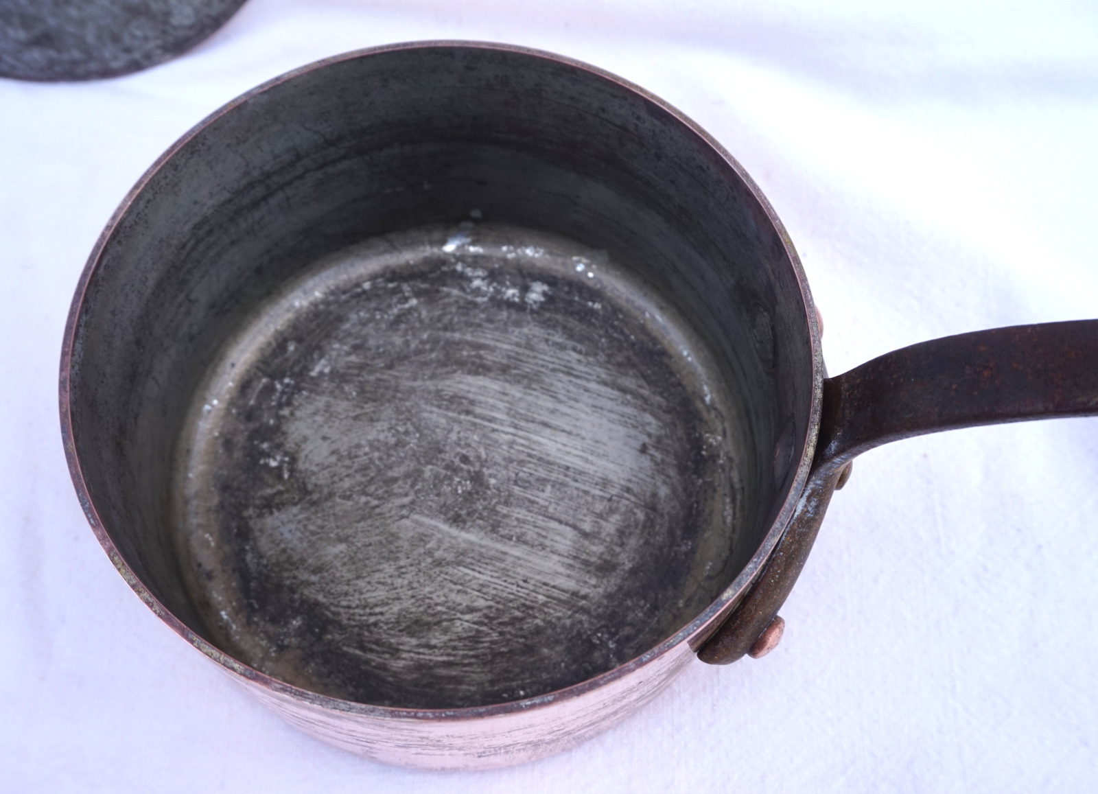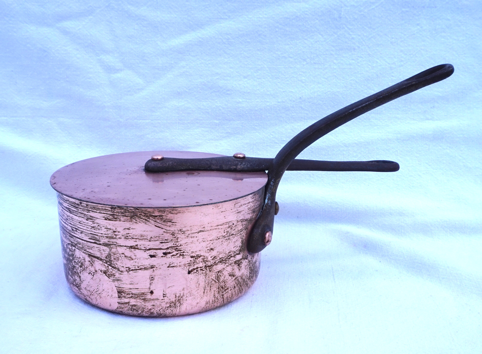 Casserole à couvercle en cuivre étamé pour le service des sauces, beurre et flambage.. Diamètre 14.2 cm, largeur avec l'anse 28 cm, hauteur sans le couvercle 7.5 cm, volume 1 l, poids total 1.360 kg, épaisseur 2 mm, contenance 0.25 l. Parfait état.