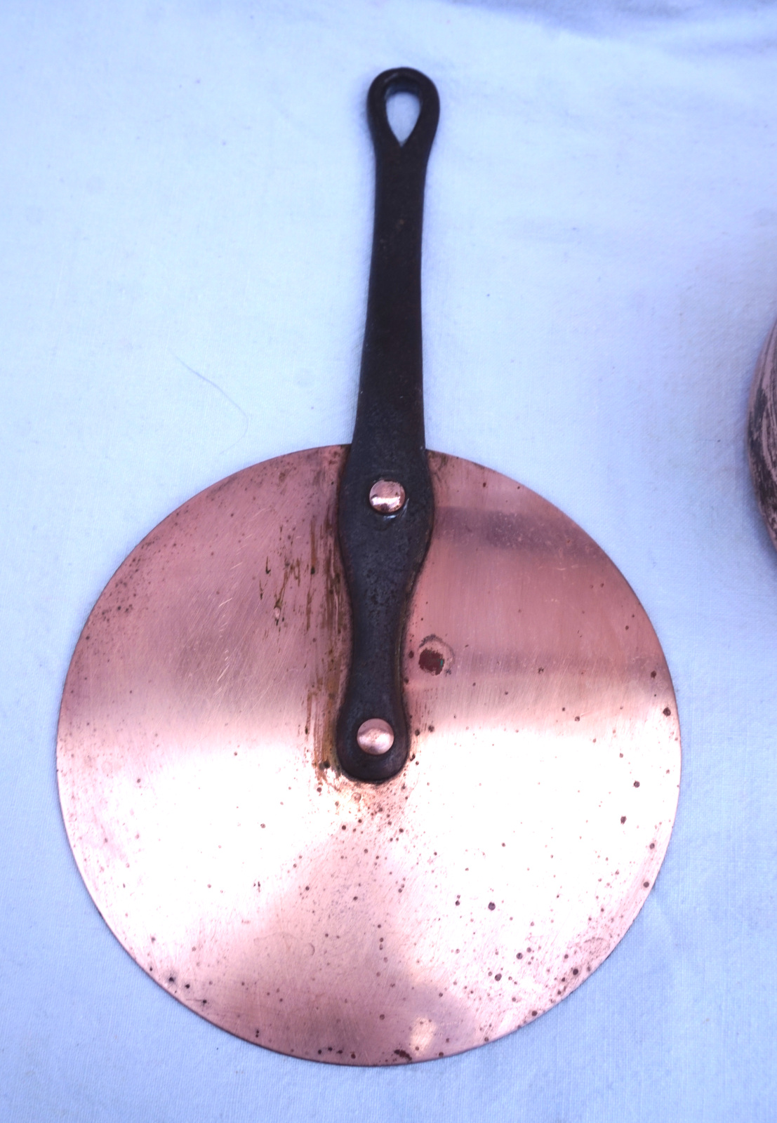 French cookware tinned copper lidded saucepan for serving sauce, butter and flame made during the 1950's. 5 1/2" (14cm) diameter, 11" (28cm) width with the handle, 3" (7.5cm) height without lid, thickness 2mm, 2lb 15oz (1.360 kilogram)total weight with lid, capacity 1 qt (1liter). Good condition condition a few stains.